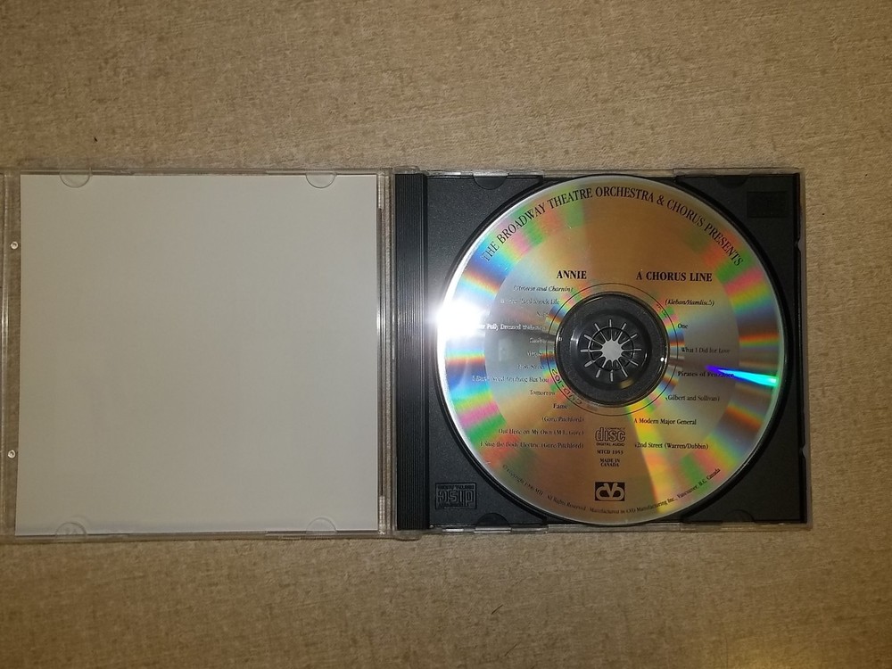 YOU ARE BIDDING ON A: Annie & A Chorus LIne Musical On CD *FREE SHIPPING* Location: DE-5 *PLEASE READ* We have listed all model information that we have available. We strive to provide all information that we have on hand and do our best to describe and photograph every part. We cannot guarantee that this part will fit your application, only an authorized dealership can do that. Please make sure that this is the correct part that you need BEFORE you buy. The best way to do this is to call a dealership and have t hem verify that this is the appropriate part number for your application. *THE FREE SHIPPING OFFER APPLIES TO THE CONTINENTAL UNITED STATES ONLY. RESIDENTS OF ALASKA, HAWAII AND PUERTO RICO WILL NEED TO EMAIL US FOR AN ACCURATE SHIPPING QUOTE * TERMS The overwhelming majority of what we sell is surplus from large companies or governments. If we say the item works, then it was tested to the best of our ability. All items and contents are described to the best of our ability. We examine all items and supply all available make/model information. We will try to answer all questions in a timely manner. PAYMENT All payment is due immediately with the "Buy It Now" feature. All payments are processed for fulfillment immediately, through PayPal's policy. If you pay by PayPal, we will ONLY ship to the PayPal confirmed or approved shipping address that you choose at the time of payment. SHIPPING & HANDLING For normal orders, orders ship between 1 to 3 business days after payment is made. We cannot control shipping time after we ship. Most itmes are shipped through USPS, with a tracking number. If an item ships via any other method, shipping/tracking information, as well as the carrier will be provided. Powered by eBay Turbo Lister The free listing tool. List your items fast and easy and manage your active items.