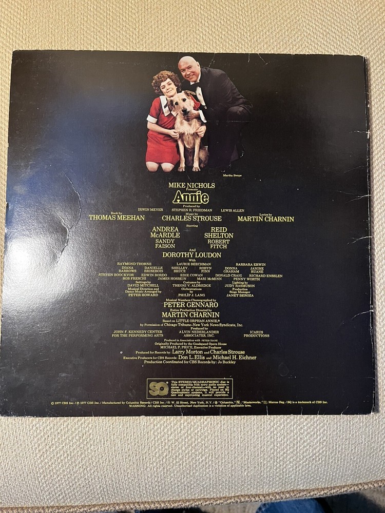 The product is the original 1977 release of "Annie A New Musical" on vinyl record. Produced by CBS Records, this 33 RPM LP features music from the musical composed by Martin Charnin. The record comes in a cardboard sleeve with a 12" size and Very Good (VG) grading for both the sleeve and inlay. This classic album is a must-have for fans of children's music and musical soundtracks, showcasing the timeless songs from the beloved musical "Annie."