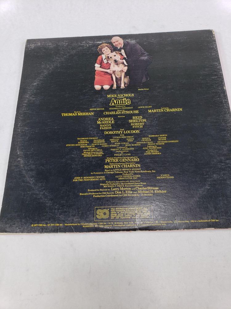 Annie A New Musical Music By Charles Strouse Book By Thomas Meehan Columbia Title: Annie A New Musical Artist: Original Cast Style: Musical/Original Cast Record Label: Columbia Duration: LP Release Year: 1977 Genre: Soundtracks & Musicals Record Size: 12" Speed: 33 RPM Special Attributes: Quadraphonic Country/Region of Manufacture: United State Condition: Used - Please see all photos for best description of condition. • The product image is the actual item you will receive unless otherwise noted. • We are a reseller and not able to provide specific fitment information. However, we can provide additional product specs so that you can determine if the item will work for you. • mo_reclaimed_freight is not sponsored by or affiliated with the brand associated with the product being sold. SHIPPING • Fast shipping is very important for us. • Your order will be shipped within 1 business day upon full payment received. • We only ship to the confirmed eBay address. We reserve the right to cancel any order for any reason at any time. • We are not responsible for undeliverable addresses. • Alaska, Hawaii and US Protectorate shipping available upon request. Buyer pays shipping calculated by location via eBay shipping tool. • OVERNIGHT and 2ND DAY AIR available at buyers expense. RETURNS • We are not an authorized dealer of this product and any warranty included with the product may not be honored by the manufacturer. • We offer a 30 day return policy and the buyer pays return shipping. • We use eBay prepaid return labels for your convenience. FEEDBACK • Your feedback is very important to us, after you receive your package and are satisfied with our services please leave us positive feedback. • If you have any problem with your order / any questions, please send us a message before leaving any type of feedback. We will take care of you! Please visit our eBay store to check out other items for sale! Thank you for shopping mo_reclaimed_freight!