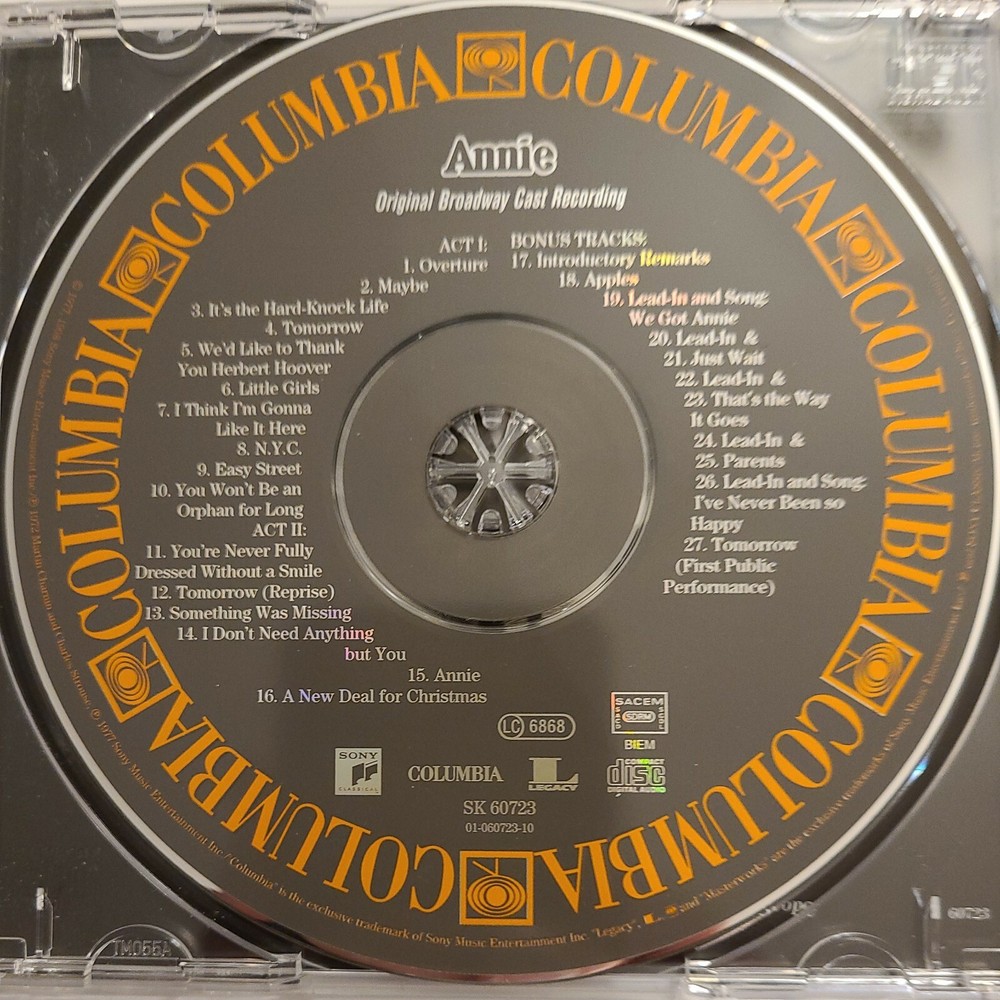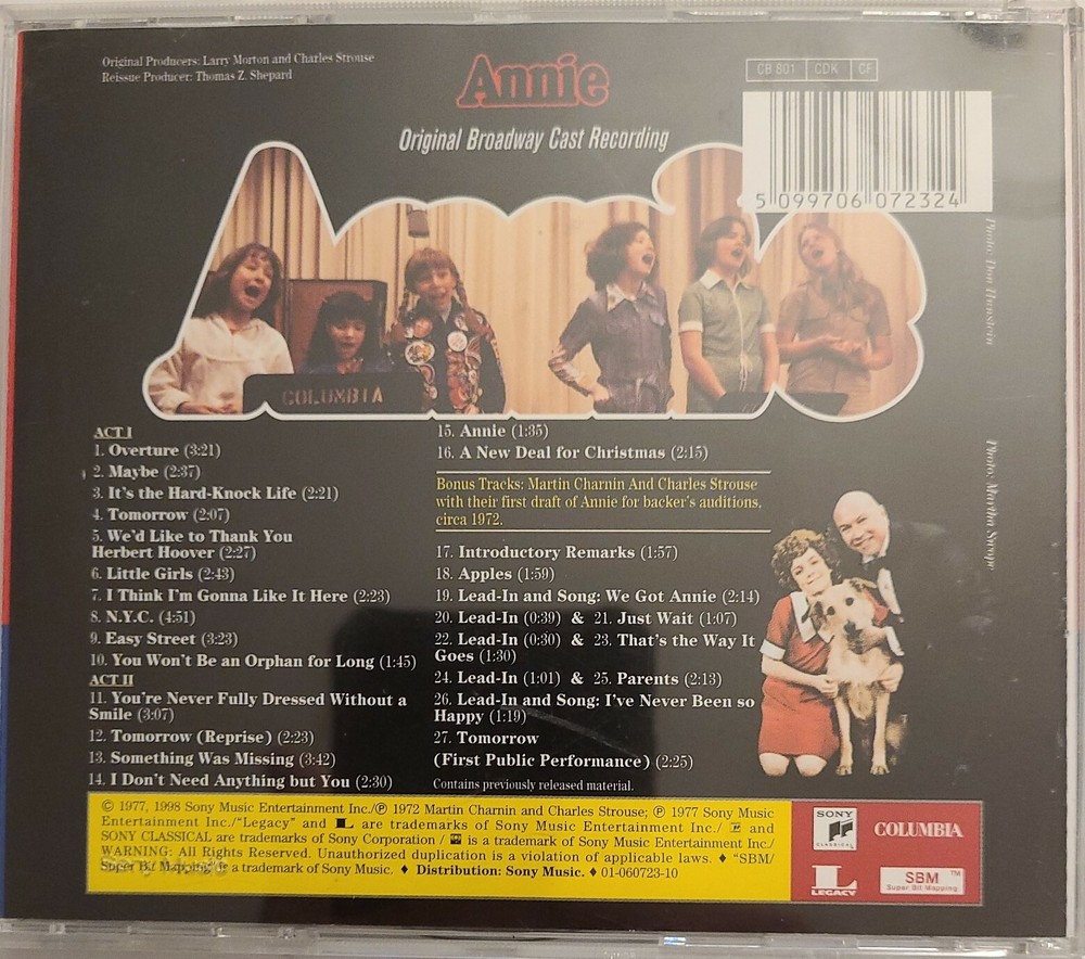 Canadian Import. Annie: A New Musical, Original Broadway Cast Recording CD (1998, Sony Music) The cd is in like new condition and the jewel case has light shelf wear. Product details Manufacturer : Sony Music Canada Entertainment Inc. Item model number : 5240014 Original Release Date : 1998 Run time : 1 hour Label : Sony Music Canada Entertainment Inc. Number of discs : 1 The original Broadway cast recording of Annie still has as much charm as it did in 1977. Charles Strouse wrote the snappy music and Martin Charnin's clever lyrics capture the misery of the Great Depression, the glitter of the upper-crust life, and the character of the FDR administration. Andrea McArdle shines in the title role, most notably with the classic anthem "Tomorrow," while Tony-winner Dorothy Loudon and Reid Shelton provide support as the hag Miss Hannigan and the benevolent Daddy Warbucks, respectively. The 1998 remastered edition includes as bonus material 17 minutes of tape Strouse and Charnin recorded for backers' auditions in 1972. They present the seven songs with some plot structure and early ideas for characters ("Miss Asthma" was a precursor for Miss Hannigan). Many of the songs didn't survive the final cut, but "Just Wait" eventually became "Little Girls" and "We Got Annie" was resurrected for the 1982 film. "Tomorrow" also appears--touted as the song's earliest recording--and Strouse and Charnin's rendition will increase your appreciation of McArdle. You won't listen to this rough draft every time you play the CD, but you'll enjoy it if you have any interest in the show. The booklet includes the original synopsis and production notes as well as new notes by Charnin on the extra tracks, but no lyrics.