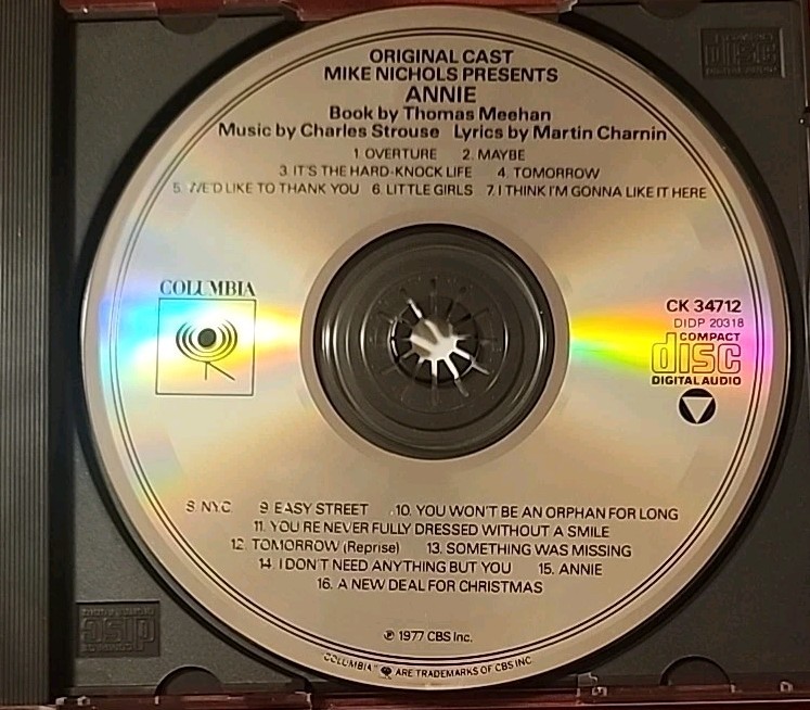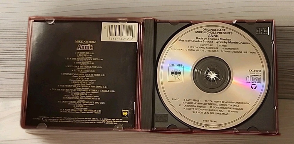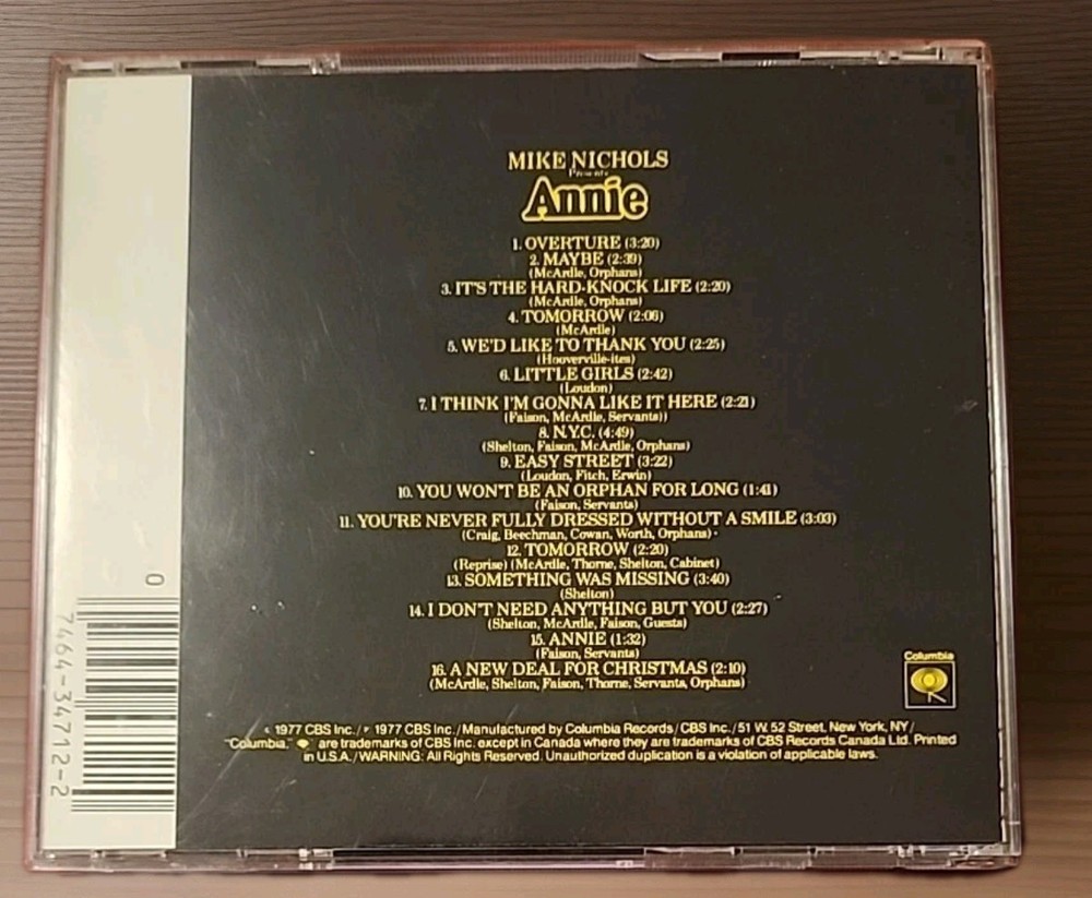The product is an original cast recording music CD of the musical "Annie" released in 1977 by Columbia. The CD features various artists and includes popular songs from the show, such as "Tomorrow" and "I'm Easy." Housed in a standard jewel case, the CD is in very good condition and is a must-have for fans of classic musicals and soundtracks. Whether you're a collector or just love the music of "Annie," this CD is sure to bring joy and nostalgia to your listening experience.