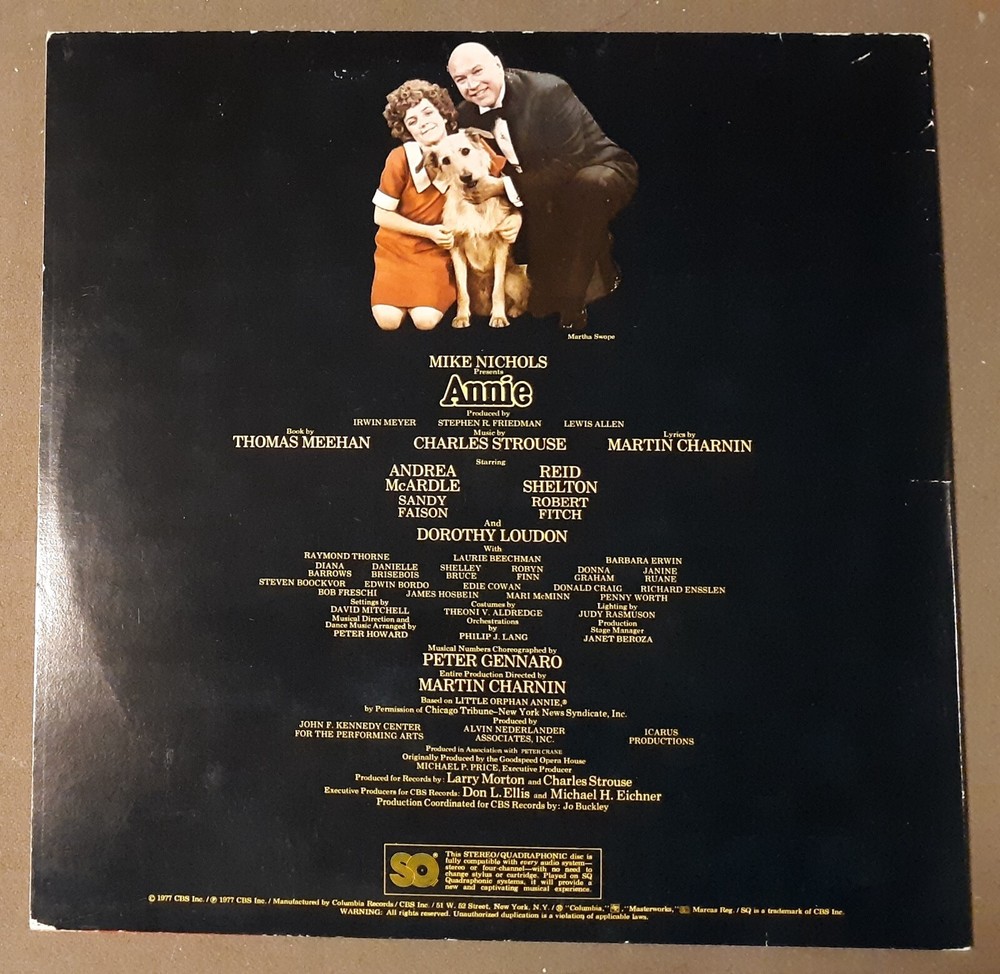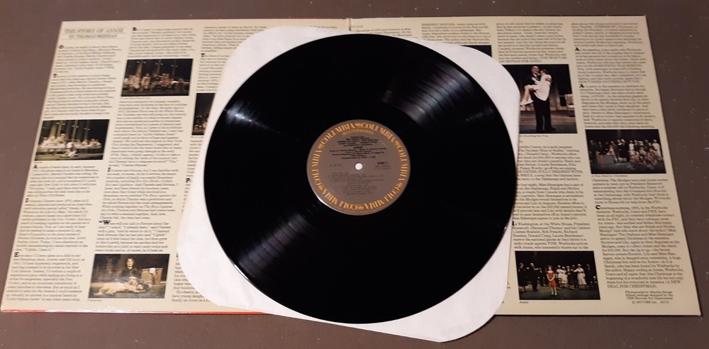 Annie A New Musical by Columbia Records 33 rpm Vinyl LP Record MU11 See my other listings for more vintage records & combine shipping. To combine shipping for "buy it now" items use the "Add To Cart' button. When you are done, VIEW your cart and then select "Request Total" Vinyl records are graded visually and listed in ebay's item specifics. There are not enough hours in the day to play test hundreds of albums that are listed and will be listed. Mint (M) Perfect Condition, which basically means that it is as good as new, literally. The vinyl has to look new and sound as though it was never played, and the cover has to look untouched. Some argue that the only mint records are brand new unopened ones still in their original packing. Near Mint (NM) Vinyl is near perfect. At most, a light scuff appears on the record, but it should play without any noise or skips. The record sleeve should also be near perfect with only minor signs of wear. There should be no" outline sleeve.) Excellent (EX or VG++) Vinyl should still play with no skips of any kind. There can be some very minor surface scuffs, but they should not affect the sound quality. The record sleeve can have some minor ring wear but it should be mostly in good shape. Also, there can be some minor creases in the corners but no splits in the seams. Very Good+ (VG+) This is the grading category where the quality of the sound is affected -- there will be some surface noise -- and the vinyl will show wear, including surface scuffs and some light scratches. However, the record is still very listenable as there are no deep scratches that cause skips. On the cover, the corners may be slightly bent, but not broken. There may be wear to the seams but not tears or holes. Very Good (VG) Vinyl doesn't necessarily look good, but still plays well enough. Surface noise will probably be present, including pops and clicks. At higher volume levels, the music should overpower any pops and clicks present. There may be seam splitting, but not complete separation of the sleeve panels from each other. There will be noticeable ring wear on the cover, but the cover should for the most part still be in good condition. Good (VG-) Vinyl is well played and looks it. However, the record should still play without skipping. It will have substantial surface noise, pops and clicks. Loss of various parts of the dynamic range will occur due to worn grooves. This grade depends a lot on the owner and the type of records he or she collects. A rock record may still sound ok at a high volume, but quieter styles of music will be practically unlistenable. The record cover may have many problems including seam splits, tears, and writing on it. Fair/Poor F) Using the word good for this quality of record is, in the opinion of JRS, too generous and not recommended since it may be misleading. Records described as fair are ones that are basically unlistenable. Surface noise, skips and pops make hearing what's on the record nearly impossible, if not completely impossible. The cover is falling apart, torn, and has writing all over it. The only reason to keep it would be if the record is extremely rare or you want to eventually melt the vinyl and shape it into an ashtray.