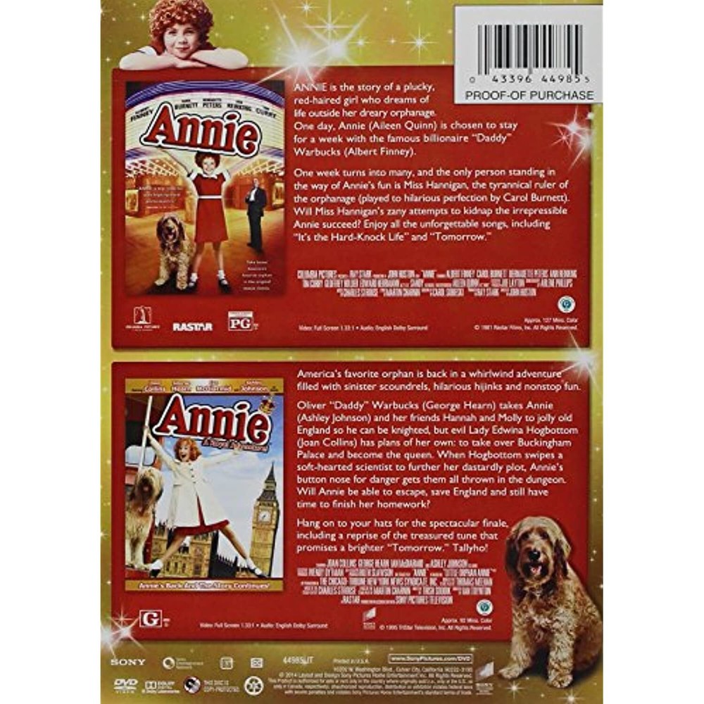 Annie: A Royal Adventure / Annie (1982) - Vol This item is used and in good condition, Discs may show light scratches from normal use but are guaranteed to play perfectly and the cover may show wear. ** No Digital Code ** Buy 2 Get 1 Free / Buy 3 Get 2 Free / Buy 5 Get 5 Free Add any 3 items in the promotion to your cart and get the lowest priced item free(B2G1). Add 5 item and get the 2 lowest priced items free(B3G2). Add 10 items and get the 5 lowest priced items free(B5G5). Mix and match from our large selection of Movies, Music, and Audio Books. Choose From Our Large Collection of Media We have a large assortment of movies on DVDs and Blu-rays, Music CDs, Audio Books, Games and more. Looking for something you don't see in our store? Contact us with what you are looking for. We have more unlisted than we do listed and we are constantly bringing in more. Flat Rate Shipping Only $3.65 Pay only $3.65 for a single item or 50 items.