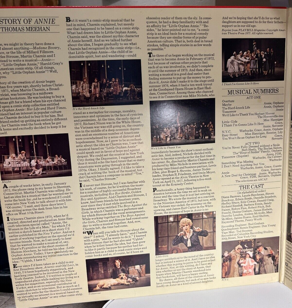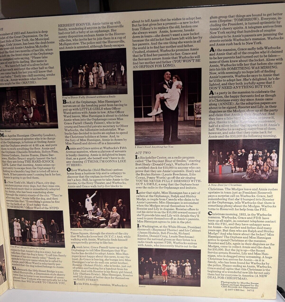 Annie - A new Musical Vinyl LP 1977 Cat# 34712 A1 Unknown Artist – Overture 3:20 A2 McArdle * , Orphans * – Maybe 2:36 A3 McArdle * , Orphans * – The Hard-Knock Life 2:20 A4 McArdle * – Tomorrow 2:05 A5 Hooverville-ites * – We'd Like To Thank You Herbert Hoover 2:25 A6 Loudon * – Little Girls 2:42 A7 Faison * , McArdle * , Servants * – I Think I'm Gonna Like It Here 2:21 A8 Shelton * , Faison * , McArdle * , Orphans * – N.Y.C. 4:49 B1 Loudon * , Fitch * , Erwin * – Easy Street 3:21 B2 Faison * , Servants * – You Won't Be An Orphan For Long 1:42 B3 Craig * , Beechman * , Cowan * , Worth * , Orphans * – You're Never Fully Dressed Without A Smile 3:12 B4 McArdle * , Thorne * , Shelton * , Cabinet * – Tomorrow (Reprise) 2:20 B5 Shelton * – Something Was Missing 3:40 B6 Shelton * , McArdle * , Faison * , Guests * – I Don't Need Anything But You 2:27 B7 Faison * , Servants * – Annie 1:32 B8 McArdle * , Shelton * , Faison * , Thorne * , Servants * , Orphans * – A New Deal For Christmas 2:10 All records are a flat fee of $7.00 for the first and combined free shipping on the rest!All Vinyl pricing has been reduced to $5 and is sold as is.