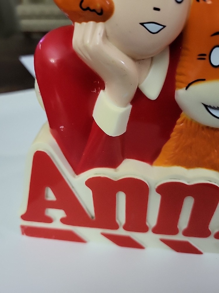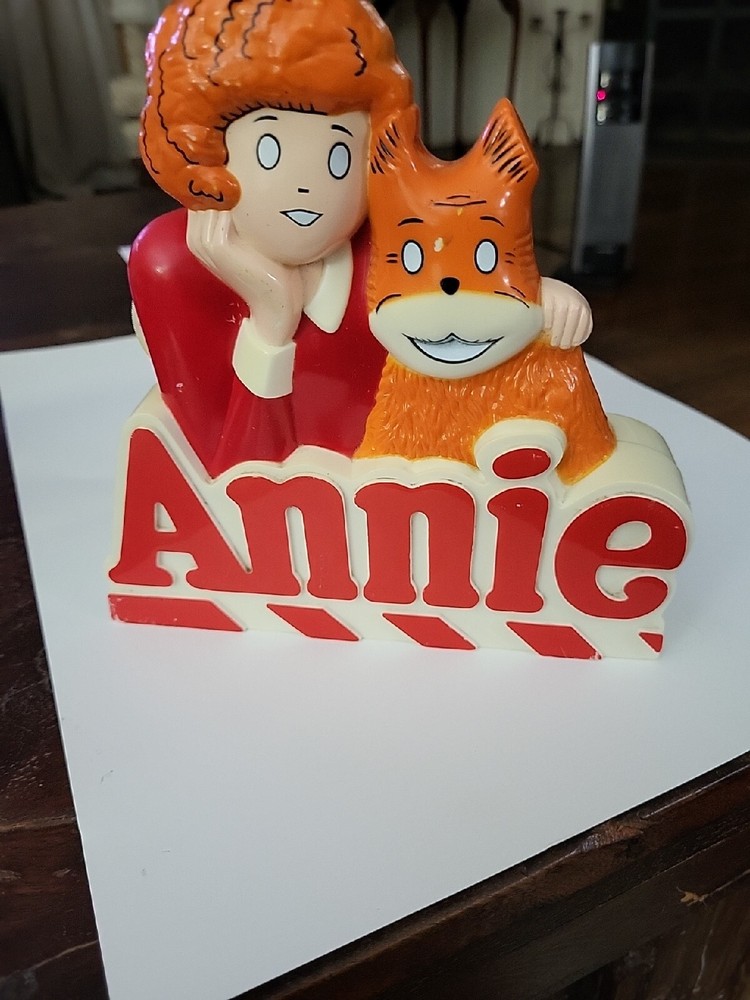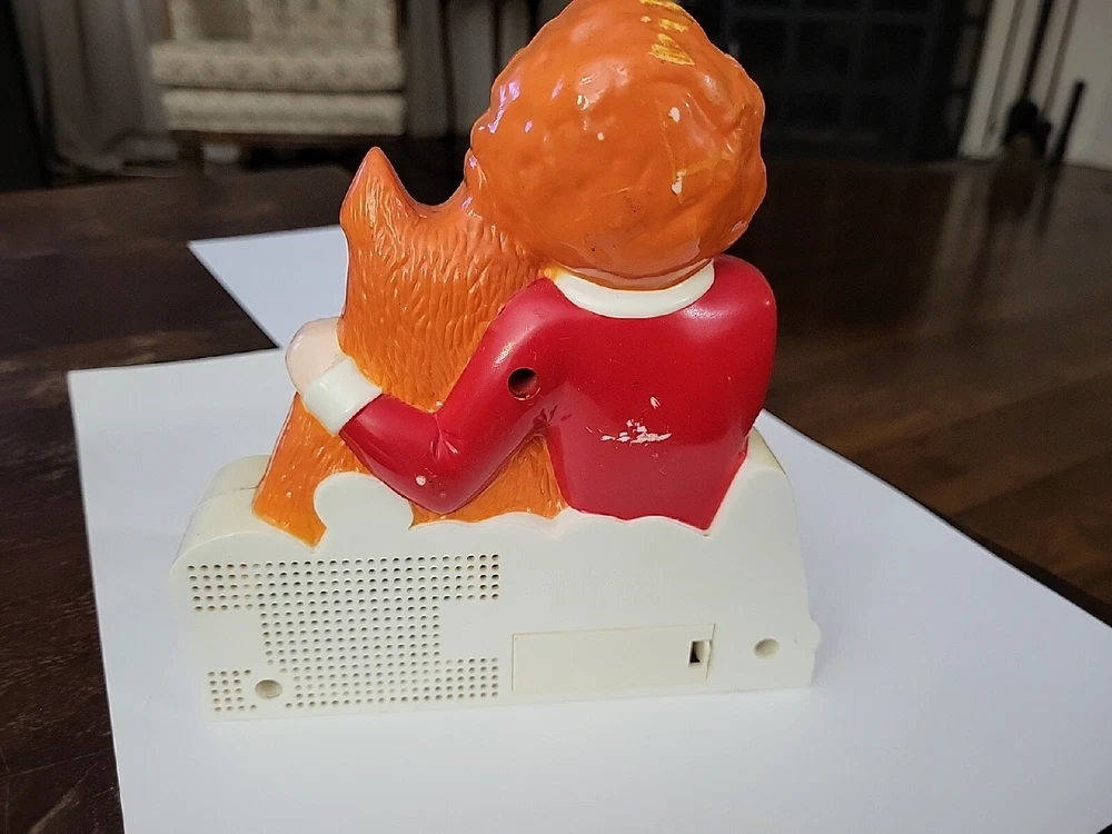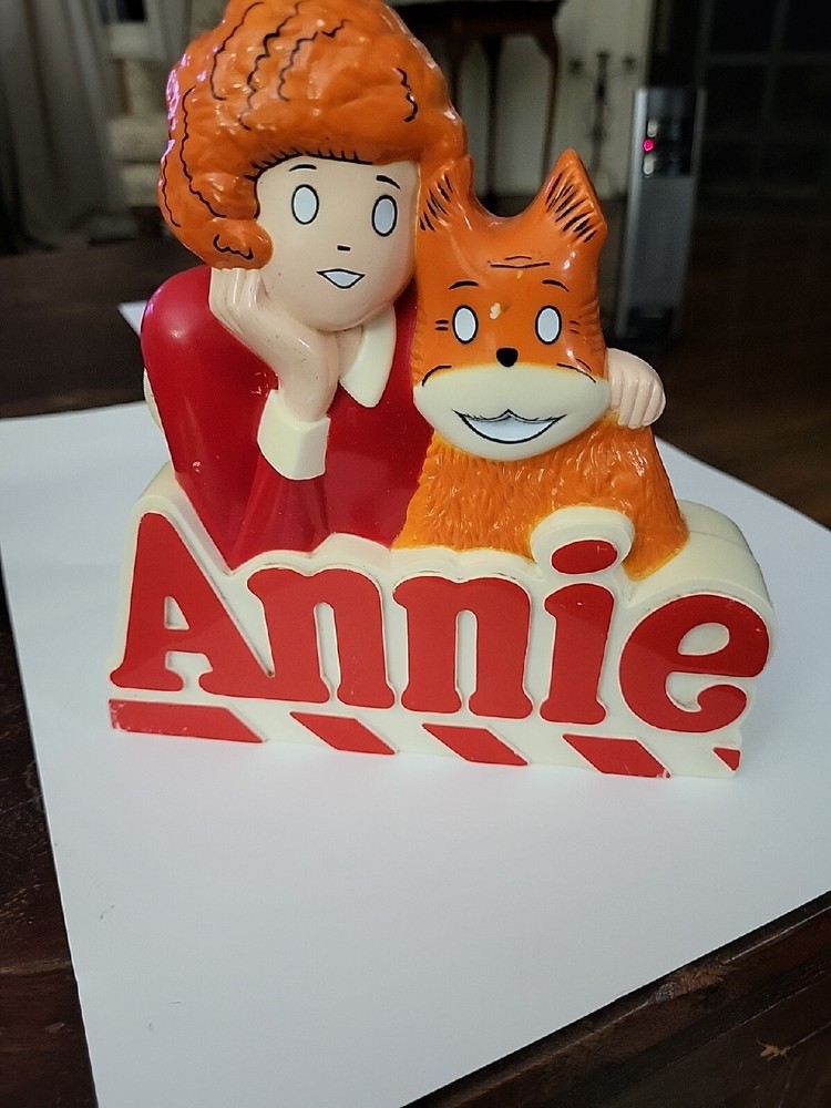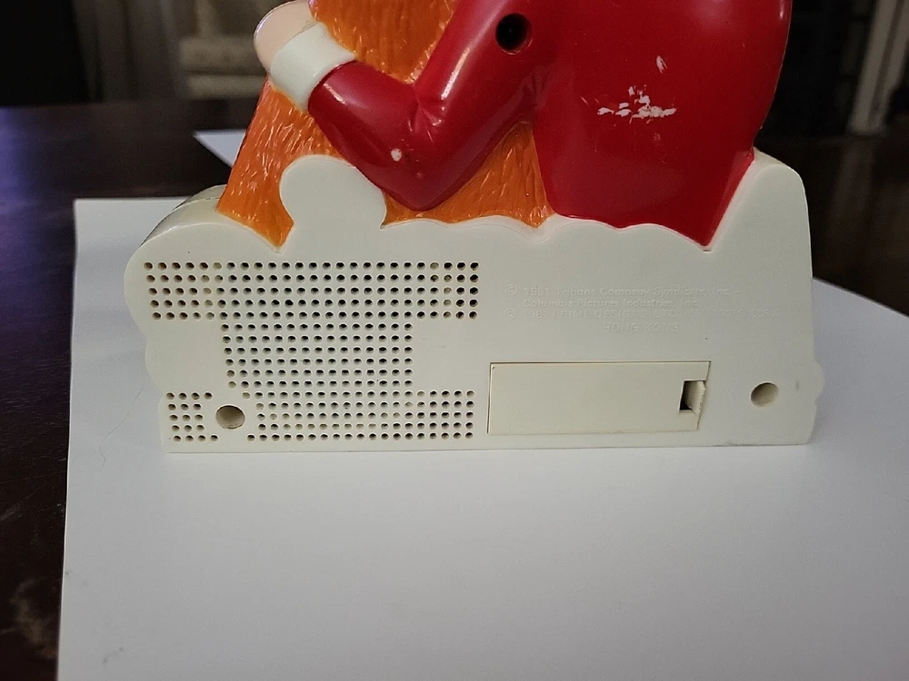 Annie AM Radio. It is a cute radio that is powered by a 9V Battery. The battery is not included. It powers up and works when tested with a battery. It measures approximately 7 by 6.5 inches at the widest parts. There is some wear and paint loss. Please see photos. Sold as found .