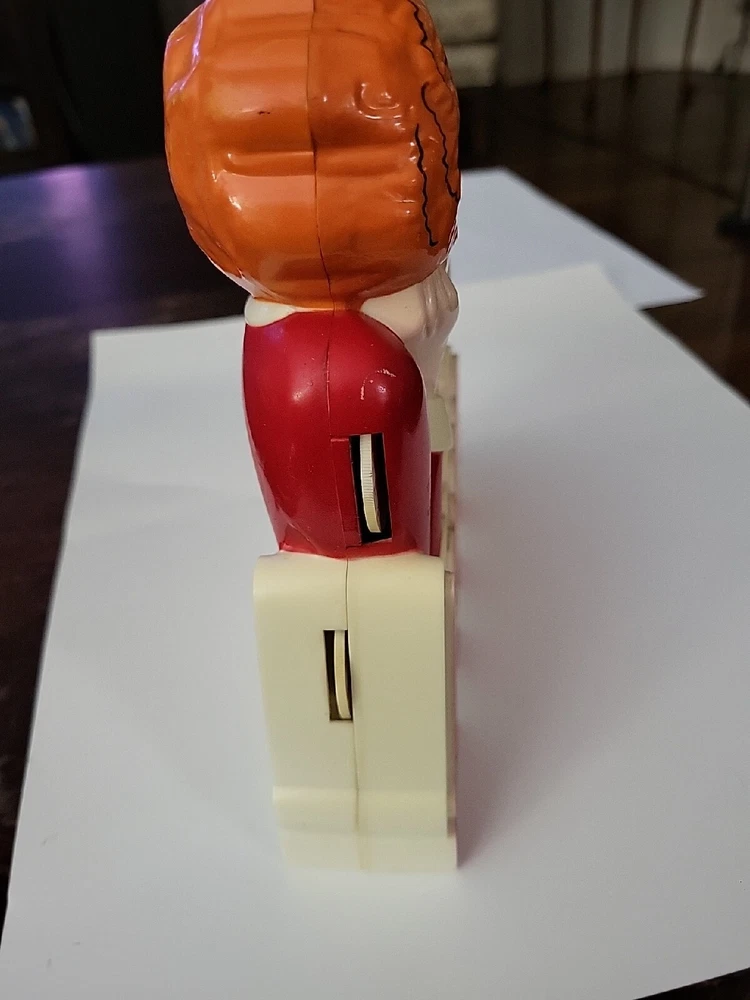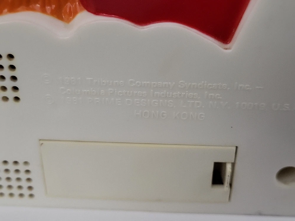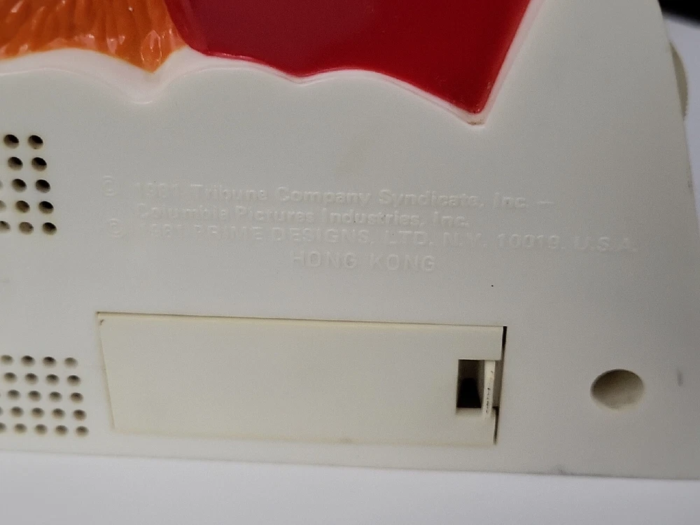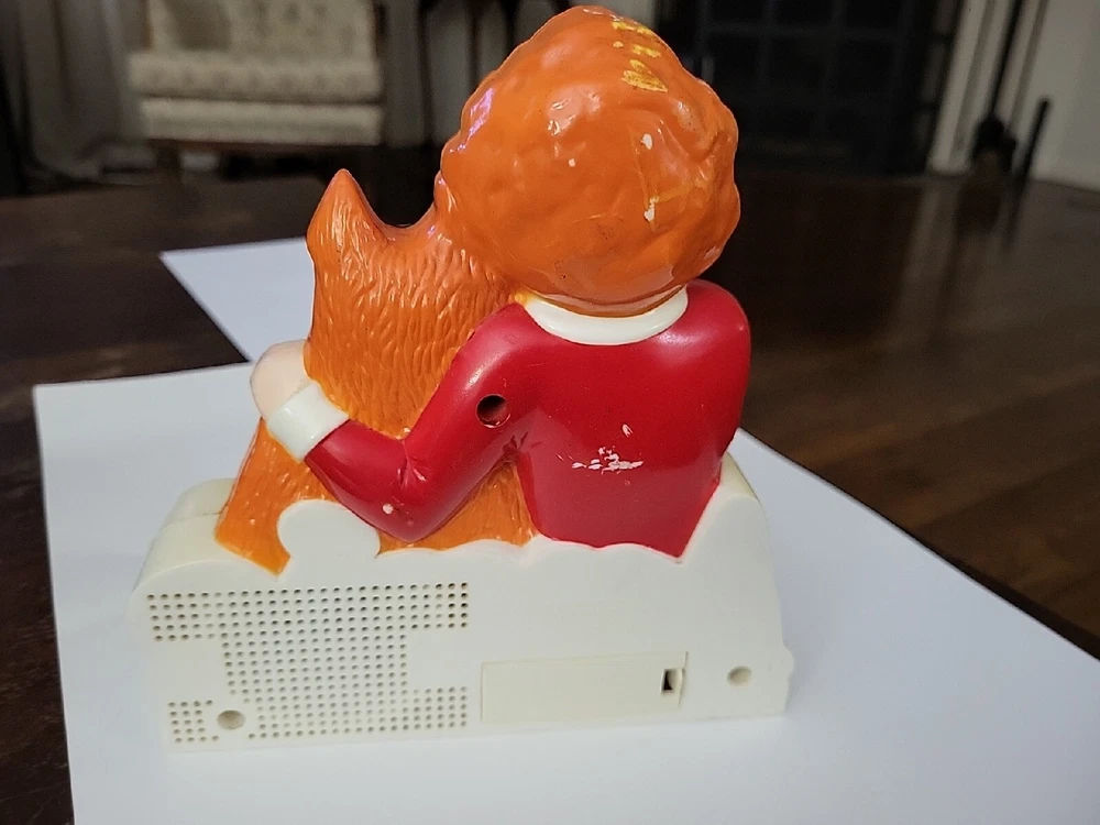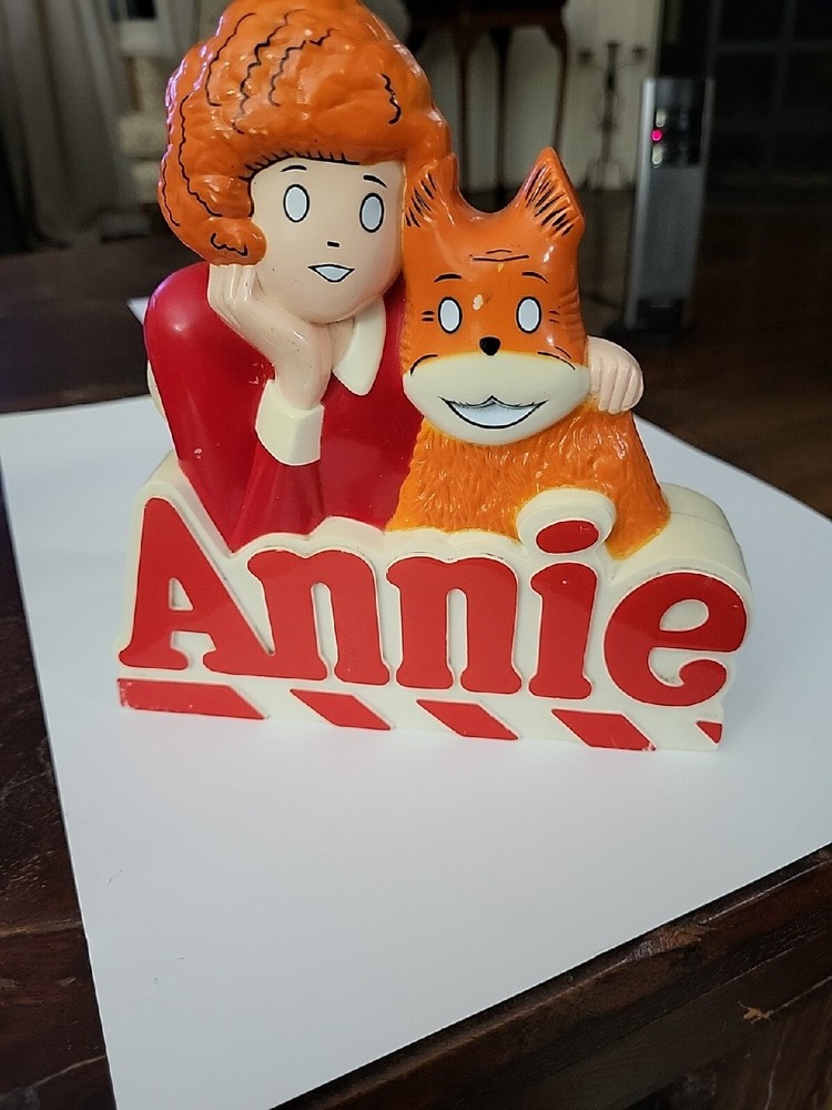 Annie AM Radio. It is a cute radio that is powered by a 9V Battery. The battery is not included. It powers up and works when tested with a battery. It measures approximately 7 by 6.5 inches at the widest parts. There is some wear and paint loss. Please see photos. Sold as found .