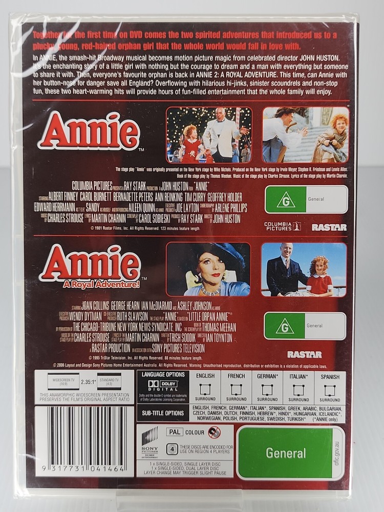 Annie / Annie - A Royal Adventure DVD, 1981 / 1995. Thank you for visiting my DVD store. All used DVD’s, Blu-ray’s and games are sold as good. They may have light scratches however they play, or they may be near new. I do this as everyone’s idea of Like New, Very Good and Good do differ. The only alternative I use is Brand New if the item is still sealed. If you do receive a DVD, Blu-ray or game that has any issues, please contact me and I will do my best to resolve as quickly as possible. Have a wonderful day!