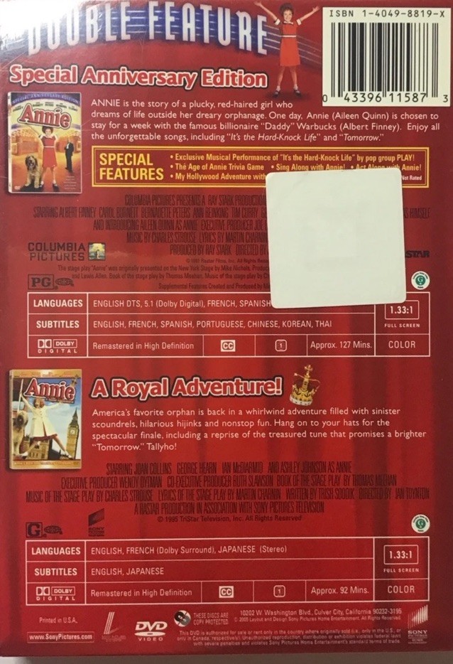 The product is a double feature 2-DVD set of the movies "Annie" and "Annie: A Royal Adventure!" The DVDs are in standard format and were released in 2009. The genre of the films is adventure, making them entertaining and engaging for viewers. This double feature set offers a great value for fans of the Annie stories, providing hours of entertainment and fun for the whole family.