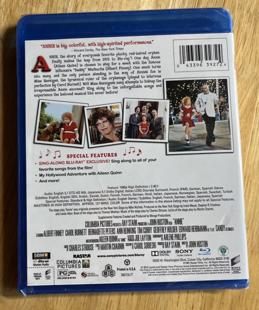 Absolutely love this classic! The picture quality on the Blu-ray is fantastic—colors pop, and the songs sound even more vibrant. Little orphan Annie’s charm shines through, making it a must-have for fans. The seller shipped quickly, and the disc arrived in perfect condition. A total joy to revisit this beloved musical!
