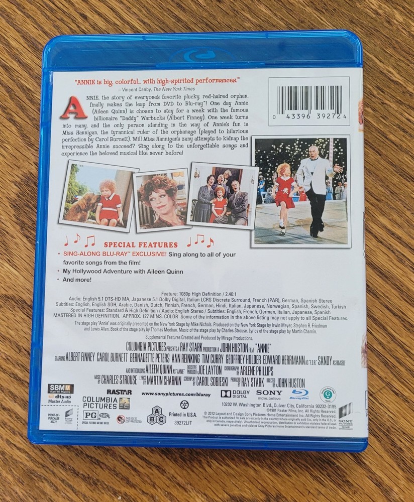 The Blu-ray version of "Annie" (1982) directed by John Huston is a family-friendly musical film presented in an aspect ratio of 2.40:1. Produced by Bridget Ikin, Raymond Stark, and Trevor Haysom, this PG-rated movie features subtitles in multiple languages including Danish, French, German, and Spanish. With a runtime of 127 minutes, this film is a beloved classic that includes a star-studded cast and iconic songs that have become a staple in the world of musical cinema.