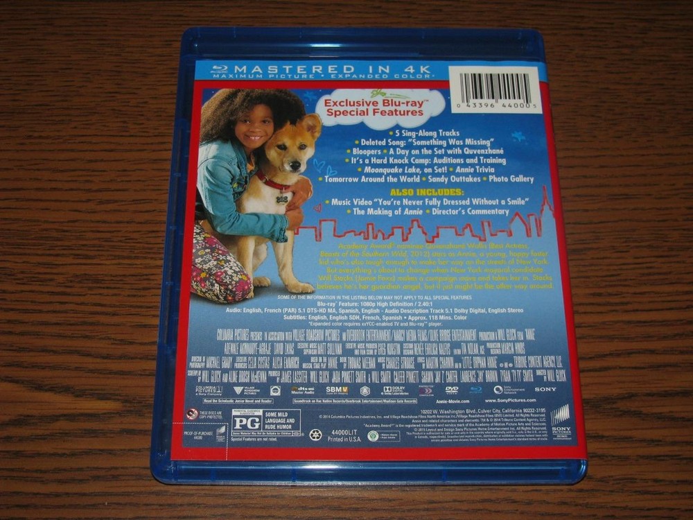 Annie (Blu-ray, 2014, 2-Disc Set, Includes Digital Copy) Annie (Blu-ray, 2014, 2-Disc Set, Includes Digital Copy) Click images to enlarge Description Annie (Blu-ray/DVD, 2014, 2-Disc Set, Includes Digital Copy) This Blu-ray is in excellent condition. DVD Disc may have minor scratches. Digital Copy Included and Valid as of 2/12/2025. I replace all Blu-ray and 4K cases with Brand New Elite cases so every case will be new. Track Page Views With Auctiva's Counter Pictures sell! Auctiva offers Free Image Hosting and Editing. Listings get noticed with Auctiva's Mobile Responsive Listing Templates.