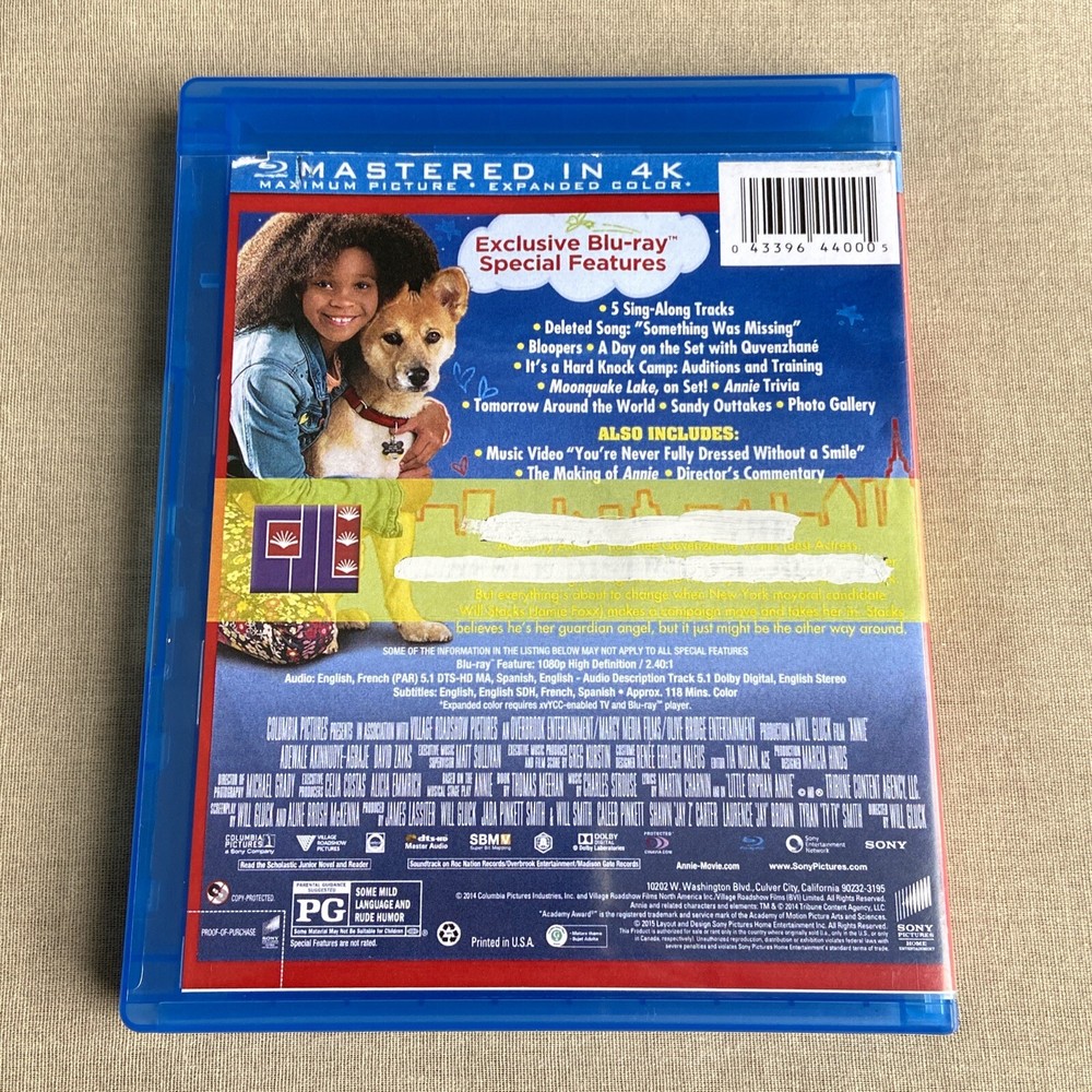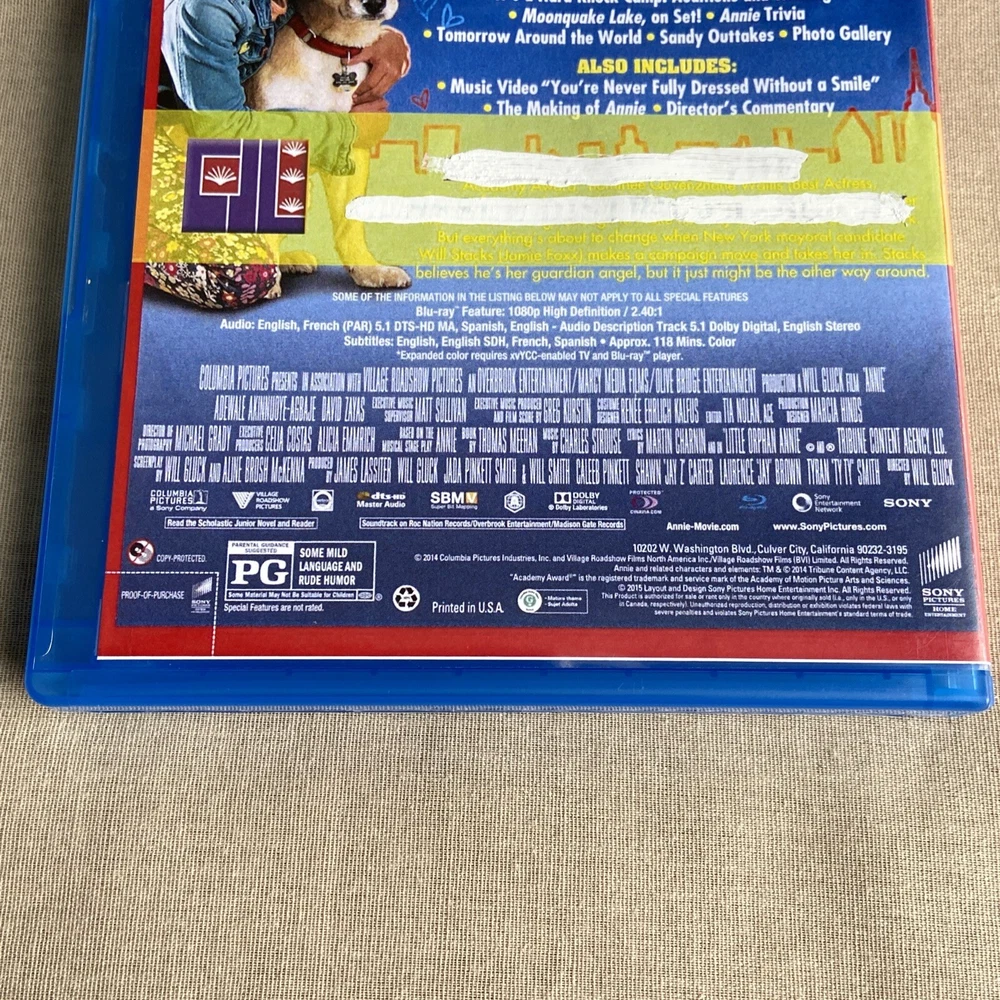 Annie -starring Jamie Foxx, Adewale Akinnuoye-Agabaje, Quvenzhane Wallis, Rose Byrne, Bobby Cannavale, & Cameron Diaz + Directed by Will Gluck. 2014 Movie / Film. -4th adaptation Widescreen. SDH, Subtitles. 118 Minutes. Special Features: 5 Sing-Along Tracks, Deleted Songs, Bloopers, A Day on the Set, Auditions & Training, Outtakes, On Set, Photo Gallery, Music Video, Making of, Commentary Columbia / Sony / Village Road Show Blu-ray release. Music / Musical / Dance / Rags to Riches / Materialism / Wealth / Hard-Knock Life / Comedy / Children's & Family / Adoption / New York / City / Mystery / Humor / Heartwarming / Inspirational / Kids / Campaign / Guardian Angel Shelf / case wear (photos). -ex-rental casing & cover art (photos). Disc has some light wear (photos) and is in working condition. -Tested. -the art-side of the disc has an ex-rental sticker around the inner-ring (photos) Please view the provided photos, items specifics, and description. Please ask any questions. Thanks for checking out our page!