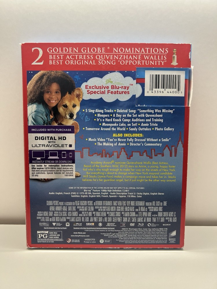 This Blu-ray edition of the 2014 movie "Annie" comes with a slipcover and is in excellent condition. The film, directed by Will Gluck, is a comedy video with a family sub-genre and has a run time of 118 minutes. The movie title and other important details are mentioned in the aspects section. The Blu-ray format ensures that you get the best audio and video quality for an enhanced viewing experience. This edition is rated NR and is perfect for anyone who loves to watch family comedies. Get your hands on this Sony Pictures studio release without worrying about the condition of the item.