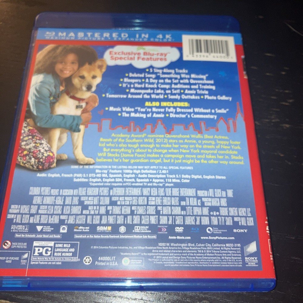 This Blu-ray disc features the 2014 movie "Annie" directed by Will Gluck. The comedy video genre and family sub-genre make it a perfect addition to any movie collection. With a run time of 118 minutes, the movie is rated NR and is suitable for all ages. The disc is in excellent working order and will provide hours of entertainment. Sony Pictures studio produced this high-quality Blu-ray disc, ensuring that the movie's brilliance is maintained. Get your copy now and enjoy the movie in high definition. If digital is included is not guaranteed to work