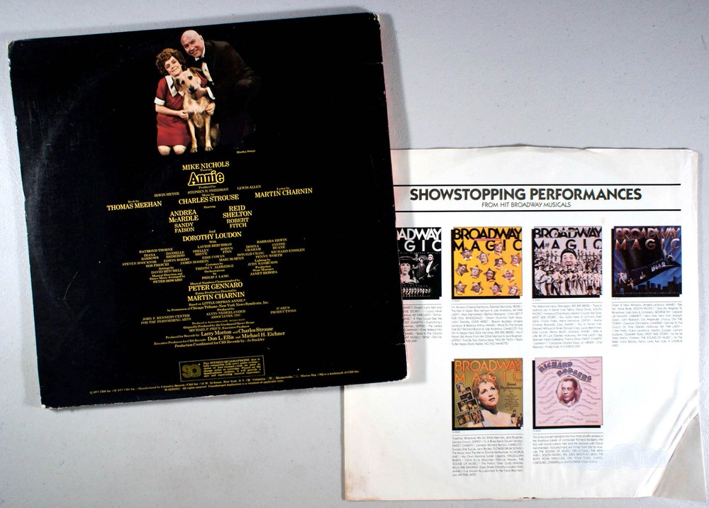 lp, album, vinyl, record, 1970s, 70s, Soundtrack, Annie, Broadway, Andrea McArdle, Orphan, Musical D E A L S : 10% off your purchase when you order 3+ records. $4.99 flat-rate shipping on orders over $50. Free shipping on orders over $100. * Search our store for more Soundtrack music. All of our used records are play-graded and come in a protective outer-sleeve. Catalog Number: JS-34712 CONDITION DETAILS Quadraphonic/Stereo. Vinyl plays with occasional light-crackles (play-graded). Gate-fold cover looks good; light-scuffing, creasing, tiny spots of surface abrasion and surface impressions (front/back); inner-gate has light scuffing and surface impressions. Front has surface abrasion near bottom center. Inner-sleeve is original (Columbia ads); two seams partially split. Spine is mostly readable with wear. Minor shelf-wear along top-edge, heavier wear along bottom edge and corners; right side of bottom edge is coming unglued. Opening is crisp with signs of use and divots. (Not a cut-out.) ABOUT THE RECORD Annie, the popular musical about the little red-headed orphan with a shaggy dog named Sandy, first opened in 1977. The character, however, originated in a comic strip -- Little Orphan Annie, which ran during the depression. The character of Annie has always been a favorite with audiences, and combined with an extremely charming and catchy score by Charles Strouse, Thomas Meehan and Martin Charnin, the musical is endearing. Songs like "Tomorrow," "Maybe" and "You're Never Fully Dressed Without a Smile" have worked their way into the public consciousness -- especially "It's Hard Knock Life." The original Broadway cast recording, starring Andrea McArdle as Annie and Reid Shelton as Daddy Warbucks, is quite good. It contains songs that were not included in the 1982 movie version, such as "N.Y.C.," an exuberant ode to the city. Fans of the movie may be discouraged by different recordings than the ones with which they're familiar, but the performances here are just as strong, if not stronger. It was nominated for eleven Tony Awards and won seven, including the Best Musical. Replacements in the title role on Broadway included then-child actors Shelly Bruce, Sarah Jessica Parker and Allison Smith. Replacements in the role of Miss Hannigan included Alice Ghostley. The show closed on January 2, 1983, after a total of 2,377 performances. Portions of our "About the Record" section are taken from information gathered from Wikipedia and AllMusic. TRACK LISTING Overture (Unknown Artist ) Maybe (Andrea McArdle and "Annie" Original Cast, Orphans ) The Hard-Knock Life (Andrea McArdle and "Annie" Original Cast, Orphans ) Tomorrow (Andrea McArdle ) We'd Like To Thank You Herbert Hoover ("Annie" Original Cast, Hooverville-ites ) Little Girls (Dorothy Loudon ) I Think I'm Gonna Like It Here (Sandy Faison, Andrea McArdle, and "Annie" Original Cast, Servants ) N.Y.C. (Reid Shelton, Sandy Faison, Andrea McArdle, and "Annie" Original Cast, Orphans ) Easy Street (Dorothy Loudon, Robert Fitch, and Barbara Erwin ) You Won't Be An Orphan For Long (Sandy Faison and "Annie" Original Cast, Servants ) You're Never Fully Dressed Without A Smile (Donald Craig, Laurie Beechman, Edie Cowan, Penny Worth, and "Annie" Original Cast, Orphans ) Tomorrow (Reprise) (Andrea McArdle, Raymond Thorne, Reid Shelton, and "Annie" Original Cast, Cabinet ) Something Was Missing (Reid Shelton ) I Don't Need Anything But You (Reid Shelton, Andrea McArdle, Sandy Faison, and "Annie" Original Cast, Guests ) Annie (Sandy Faison and "Annie" Original Cast, Servants ) A New Deal For Christmas (Andrea McArdle, Reid Shelton, Sandy Faison, Raymond Thorne, "Annie" Original Cast, Servants, and "Annie" Original Cast, Orphans ) Important (please read): Our used records are play-tested in their entirety and rated accordingly. We DO NOT necessarily make note of, or take into consideration, any visual imperfections that do not affect the sound while being played on our record players (your record player may give slightly different results). If you would like a visual description of the vinyl itself, please ask, and we will be happy to provide one for you. Please visit our store to find other items (and sign-up for our Weekly Newsletter of newly-listed items and specials). If there is another title by the same (or a similar) artist that you don't see listed in our store, please contact us - we take requests !! We usually ship orders three (3) business days, or sooner, after payment is completed (the day of purchase, Holidays and weekends are not business days). Please take note of the estimated delivery date (which is located at the top of the page, beneath the price box). Media mail sometimes takes longer than the estimate shown. If you need your order more quickly, please select an expedited service at check-out. US Protectorates , Hawaii , Alaska , International , APO , and FPO orders can take longer to arrive (sometimes up to several months), but will be shipped in the time stated. Promotional shipping offer: $4.99 flat S&H for orders totaling $60 or more for 2+ albums. For orders under $60, we combine shipping (it will be calculated at check-out or sent through an invoice). * The best coupon is selected for you at checkout. Coupons do not combine with each other. Coupons do not apply when "best offer" is accepted. Applies to sealed old-stock and used vinyl. **NOTE: If multiple copies of the same album are available at the time of your purchase, you will receive the copy listed at the time. Another copy will replace it with different pictures and a different condition description, possibly even a different pressing. Keywords: #lp #album #vinyl #record #1970s #70s #Soundtrack #Annie #Broadway #AndreaMcArdle #Orphan #Musical