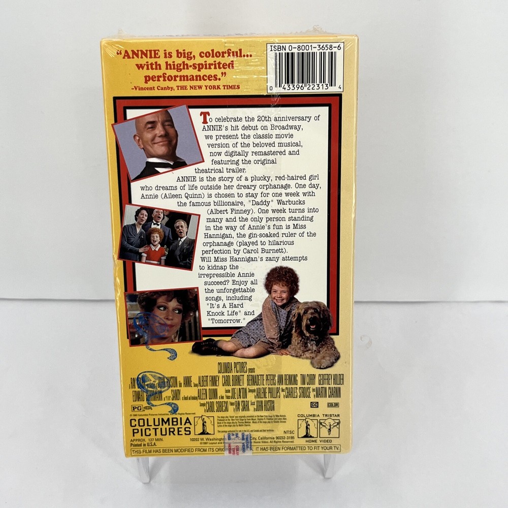 This Annie Broadway Tribute Edition VHS tape, released in 1997, is a must-have for fans of musicals and performing arts. Directed by John Huston, this Special Edition features a star-studded cast including Albert Finney, Carol Burnett, and Tim Curry. The tape is in the NTSC Signal Standard and has a G Rating, making it suitable for all ages. The VHS tape is in English language and has never been rented. It is a sealed package, ensuring the integrity of the product. The Studio behind this production is Columbia Pictures, and it was made in the United States. This item is perfect for collectors and enthusiasts of musicals and Broadway performances.