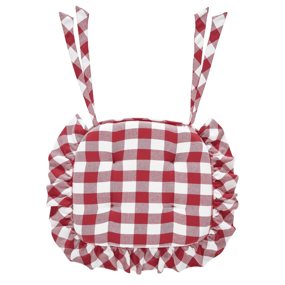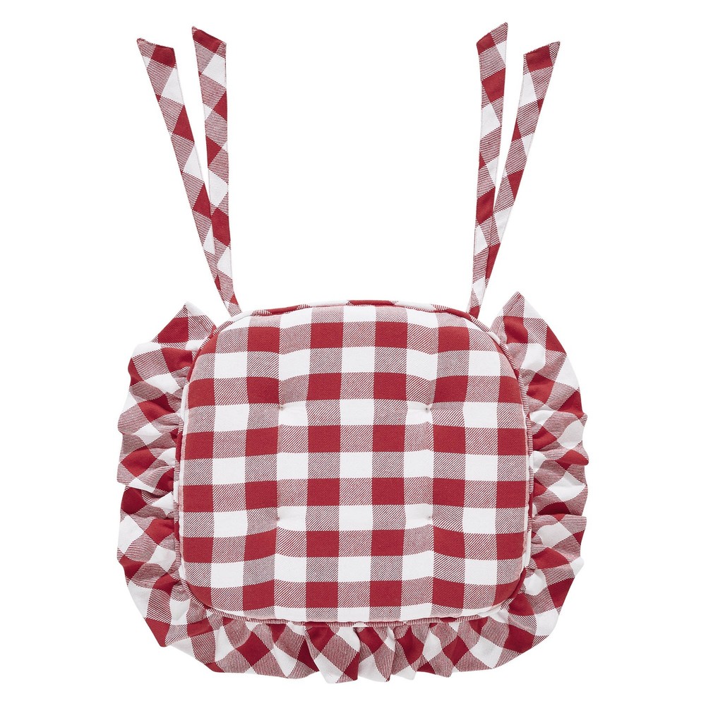 Shop VHC Annie Buffalo Check Collection Annie Buffalo Check Red Ruffled Chair Pad 16.5x18 Elevate your dining experience with the VHC Brands Chair Pad from the Annie Buffalo Check Collection in Country Red. Measuring 16.5x18 inches, this chair pad combines the timeless charm of farmhouse and country aesthetics with its enduring buffalo check pattern. Crafted from durable twill weave cotton, this chair pad adds a textured touch to your indoor seating while providing enduring comfort. Designed with practicality in mind, this chair pad features secure ties that ensure a snug and stylish fit, enhancing both the comfort and appearance of your chairs. The classic plaid design is both versatile and fashionable, making it an ideal addition to farmhouse-inspired kitchens and dining rooms. With a firm yet comfortable filling, this chair cushion offers lasting support for prolonged periods of sitting, whether for meals or relaxation. The Annie Buffalo Check Chair Pad in Country Red effortlessly complements various interior styles. Whether it's enhancing the character of your farmhouse kitchen or adding a cozy touch to your country-themed dining room, this chair pad brings together style and functionality in perfect harmony. Enjoy the best of both worlds with this charming chair pad, ensuring your chairs are as inviting as they are visually appealing. Features Farmhouse Elegance: Elevate your dining room or kitchen chairs with the Annie Buffalo Check Chair Pad from our Country Farmhouse Collection. The timeless Country Red Buffalo Check pattern adds a touch of farmhouse elegance to your decor. Quality Twill Weave: Crafted from high-quality Twill Weave cotton, this chair pad are built to last. The Foam Insert ensures a comfortable seating experience, making every meal a cozy affair. Secure Ties: Say goodbye to slipping and sliding - this chair pad come with ties to securely fasten them to your chairs, providing a stable and comfortable seating arrangement for family and guests. Tucked Detailing: The tucked detailing on this chair pad adds a touch of sophistication to your dining area. It's the little details that make your space uniquely stylish. Versatile Buffalo Check: The classic Buffalo Check pattern effortlessly complements various decor styles, making this chair pad a versatile addition to your farmhouse, indoor dining space, or wherever you need a pop of charm. Easy Maintenance: Designed for convenience, this chair pad are easy to clean and maintain, making them a practical and fashionable choice for your dining room or kitchen. Enjoy both style and functionality with this chair pad. Spot Clean, Do Not Iron. Specifications Material: 70% Cotton / 30% Cotton Polyester Blend Shell, Foam Insert Colors: Country Red, Soft White Manufacturer Country: India Care: Spot Clean Weight: 1.1 lb Dimensions: 16.5" x 18" x 2.5"
