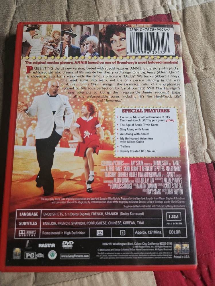 Experience the classic musical tale of Annie, brought to life in this Special Anniversary Edition DVD. With a PG rating and a run time of 127 minutes, this family-friendly film is perfect for all ages. Featuring talented actors and a captivating storyline, this DVD is a must-have for any fan of musicals. This DVD is in the format of a disc and is brought to you by Sony Pictures. The sub-genre is family and the genre is musicals (theatrical). Whether you're a die-hard fan or a newcomer to the story, this Annie DVD is sure to delight.