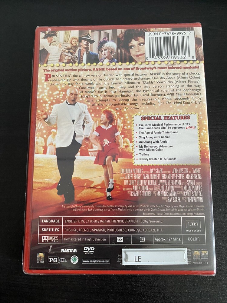 Experience the timeless classic that defined an era with the Annie DVD 1982 Special Anniversary Edition Fullscreen. This DVD features a PG-rated musical masterpiece directed by John Huston and produced by Bridget Ikin, Raymond Stark, and Trevor Haysom. Starring Albert Finney, Bernadette Peters, and Carol Burnett, this movie is a must-watch for any family that loves musicals. With a runtime of 127 minutes, this DVD is packed with special features, including full-screen format, Chinese, English, French, Portuguese, and Spanish subtitles, and a special edition and anniversary edition. Don't miss out on this fantastic opportunity to own a piece of movie history. United States buyers only with no international shipping.