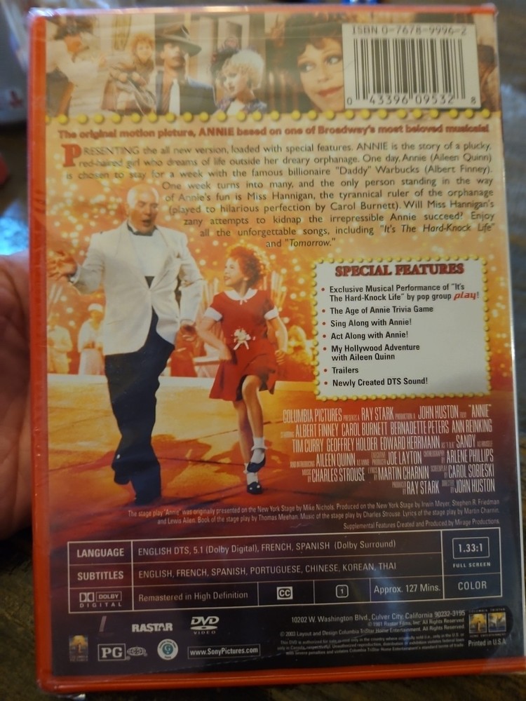 This is a special anniversary edition DVD of the 1982 musical film, Annie. Starring John Huston and directed by Terry Miller, this PG-rated movie follows the story of a young orphan girl named Annie who dreams of finding her biological parents. The movie features a cast of characters. This DVD comes with subtitles in Chinese, English, French, Portuguese, and Spanish, and is available in English, French, and Spanish languages. Produced by Bridget Ikin, Raymond Stark, and Trevor Haysom, this 127-minute DVD is a must-have for fans of the musical genre and families who enjoy heartwarming stories.