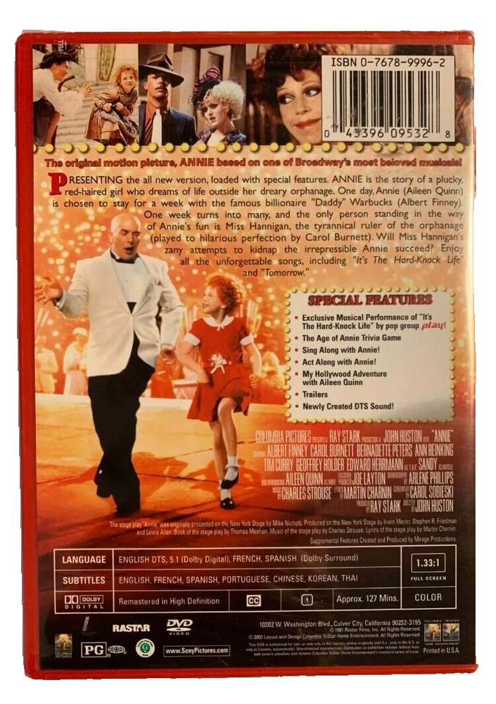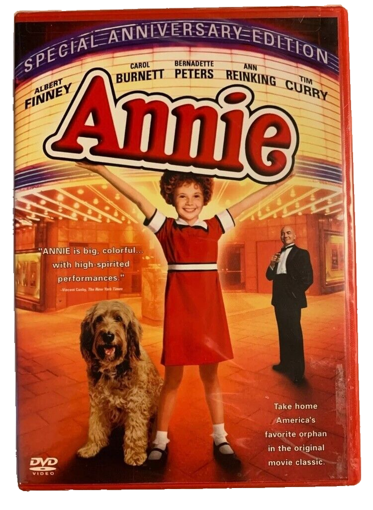 This Annie DVD is a special anniversary edition featuring the iconic Carol Burnett and Tim Curry. The DVD is still sealed and has never been opened. It is a must-have for fans of the 1982 film and includes all the classic musical and Broadway elements that made it a hit. The DVD format is perfect for family viewing and is sure to become a treasured addition to any collection. Get your hands on this limited edition Annie DVD today!