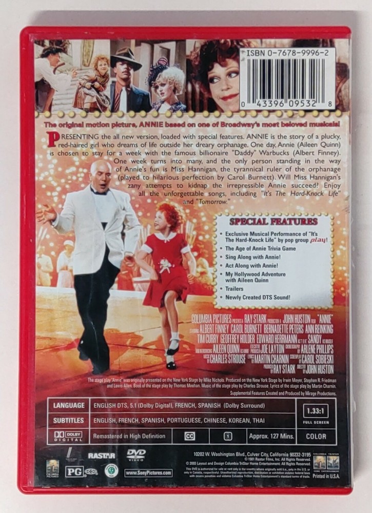 Annie (DVD, 2004, Special Anniversary Edition) "Pre-Owned" This disc has a few very light surface scratches. Has been cleaned and tested. Works as it should. Case is in good condition. Cover artwork may have some moisture damage, it has some wrinkles. See photos for best description. Visit my store for other great items. Combined shipping is available. Thanks For Shopping Dustys Flippin Resale Store. Have A Wonderful Day!