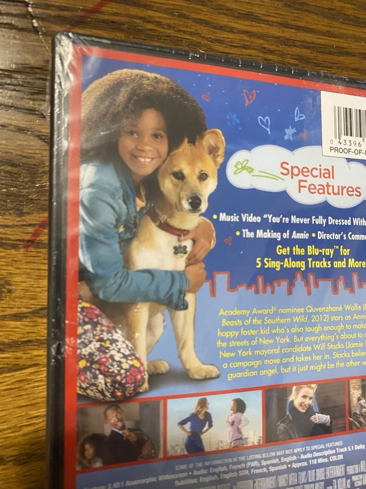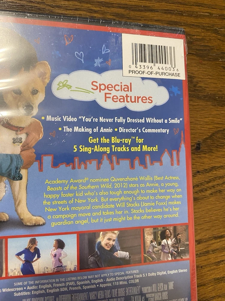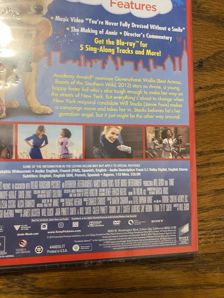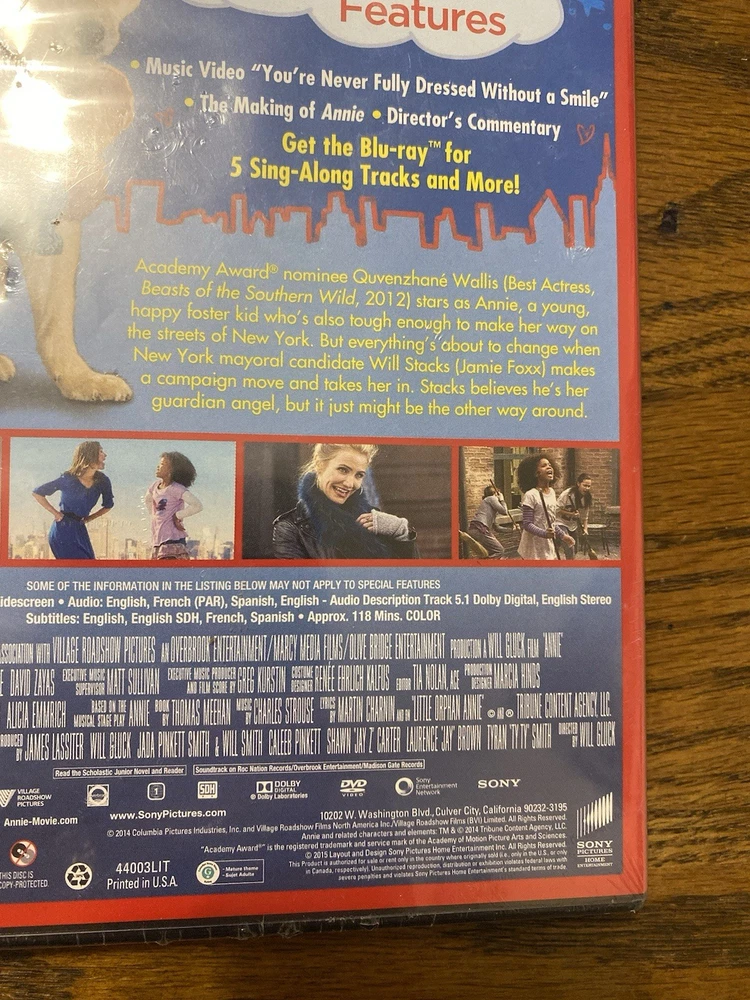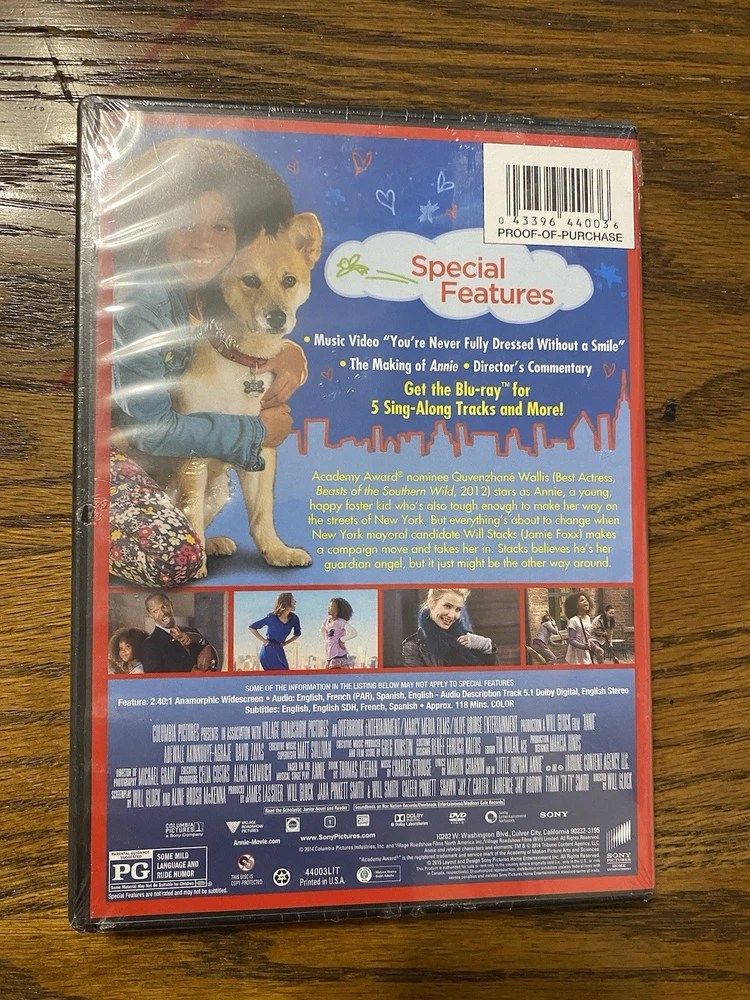 Annie (DVD, 2014) stars Jamie Foxx, Rose Byrne, Cameron Diaz, and Bobby Cannavale in a modern adaptation of the classic musical. Directed by Will Gluck, this comedy video features a family-friendly sub-genre and has a run time of 118 minutes. The DVD is in the format of a standard single-disc edition and is rated NR (Not Rated). This rare edition of Annie is a must-have for fans of the genre and collectors alike. The movie title is prominently displayed on the cover of the DVD case, and the actors' names are listed in the credits. Add this item to your collection of movies and TV on DVD and Blu-ray Discs today.
