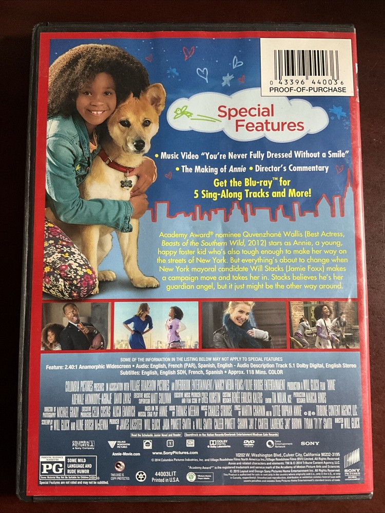 Get ready to laugh and be entertained with this hilarious comedy video, "Annie"! Released in 2014 by Sony Pictures, this DVD features a run time of 118 minutes and a rating of NR. The movie follows the story of a spunky and independent girl named Annie, who is sent to live with her wealthy and eccentric Uncle Henry after her parents die. While living with Uncle Henry, Annie discovers a hilarious conspiracy that causes her to question everything she knows about her family's past. This family-friendly movie is perfect for those who enjoy a good laugh and a heartwarming story. Don't miss out on adding this DVD to your collection! You are bidding on a used DVD, this The DVD is in good condition. The above pictures are for reference only. The DVD might be full-screen or widescreen. The DVD may be standard edition or special collector edition. There may be additional stickers on the DVD. The DVD all are in good condition and it is the luck of the draw of what I have in stock.