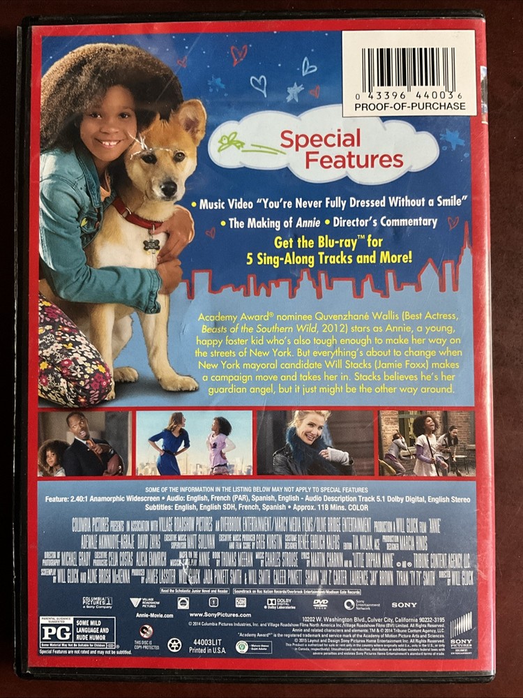 Get ready to sing and dance with the Annie DVD, released in 2014 by Sony Pictures. This family-friendly comedy video, directed by Will Gluck, features a heartwarming story of a young girl named Annie who finds adventure and love in the big city of New York. With a run time of 118 minutes, this DVD is perfect for a cozy family movie night. The Annie DVD is in excellent condition and is a great addition to any movie collection. It features the movie title "Annie" and falls under the categories of "Movies & TV" and "DVDs & Blu-ray Discs". This DVD is rated NR and belongs to the Sub-Genre of Family. Get your hands on this classic tale of love, adventure, and the power of imagination. You are bidding on a used DVD, this The DVD is in good condition. The above pictures are for reference only. The DVD might be full-screen or widescreen. The DVD may be standard edition or special collector edition. There may be additional stickers on the DVD. The DVD all are in good condition and it is the luck of the draw of what I have in stock.