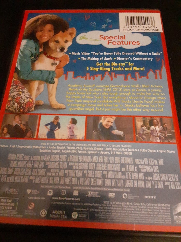 Get ready to laugh and be inspired by the 2014 comedy video, "Annie". This DVD features a talented cast and uplifting story that will leave you feeling great. The movie is perfect for families and anyone who enjoys a good laugh. With a run time of 118 minutes, this DVD is a great addition to your collection. The format is DVD and the release year is 2014. The movie is rated NR and falls under the category of movies and TV, DVDs and Blu-ray discs. The studio behind this masterpiece is Sony Pictures. Get your copy today and experience the joy of "Annie"!