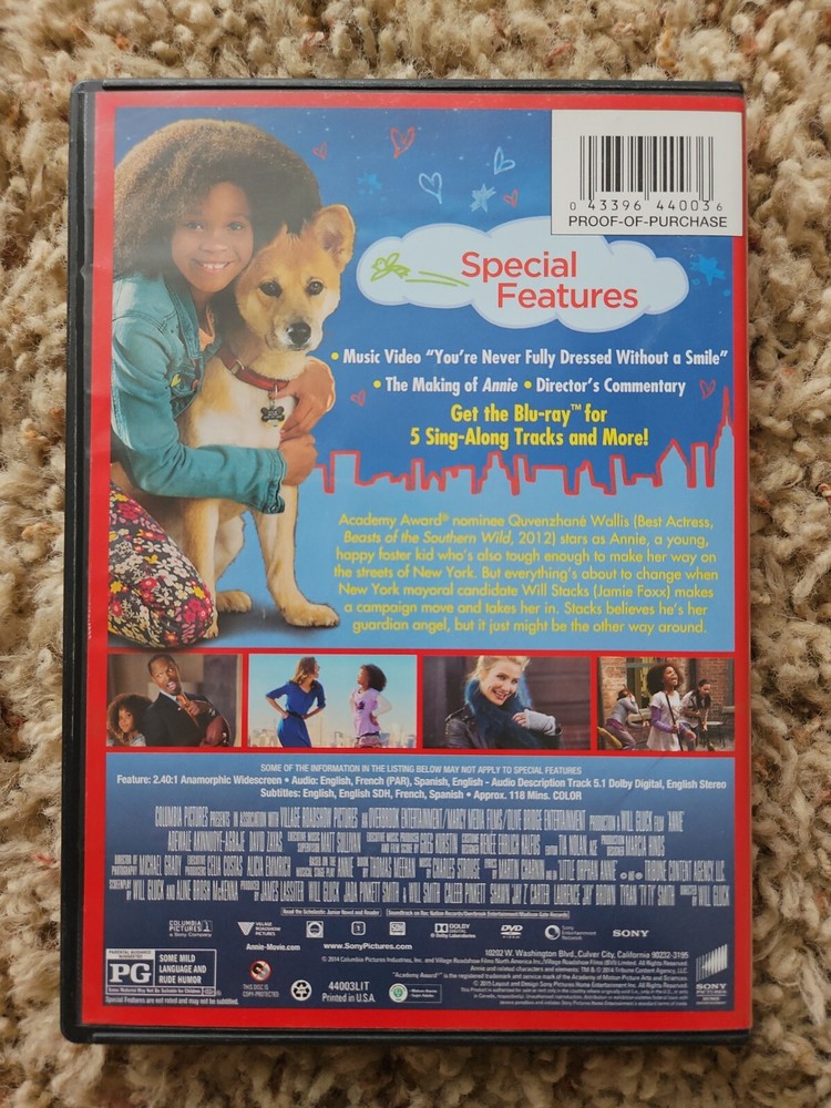 This DVD features the beloved family comedy "Annie" by Sony Pictures, released in 2014. The film is rated NR and offers a heartwarming story that is sure to entertain viewers of all ages. The DVD format is ideal for those who prefer physical media, and the item is perfect for collectors and fans of classic films. The movie tells the story of a plucky young orphan named Annie who dreams of finding a loving family to call her own. With charming performances, catchy musical numbers, and a heartwarming message about the power of hope and optimism, "Annie" is a timeless classic that will remain a beloved favorite for generations to come. This DVD is a must-have for any fan of family-friendly comedies or classic Hollywood films.