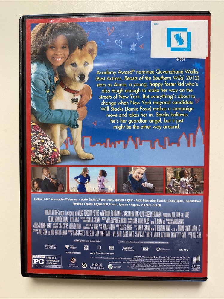 Get ready for a heartwarming and hilarious adventure with 'Annie (2014 film)'. Follow the story of the spunky and optimistic Annie, played by Quvenzhane Wallis, as she navigates the challenges of life with her adoptive father, played by Jamie Foxx. Along the way, she encounters a cast of unforgettable characters, including the cunning and hilarious Miss Hannigan, played by Cameron Diaz. This DVD features widescreen format and is available in English, French, and Spanish language options. With a PG rating, it is suitable for all ages. Perfect for family movie nights or as a gift, 'Annie (2014 film)' is a must-have addition to any movie collection.