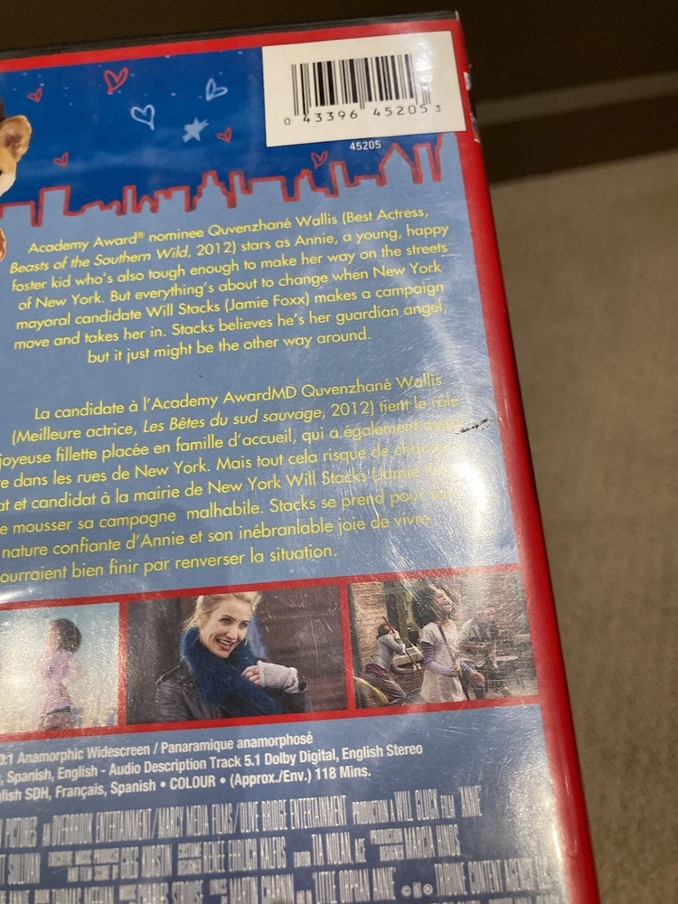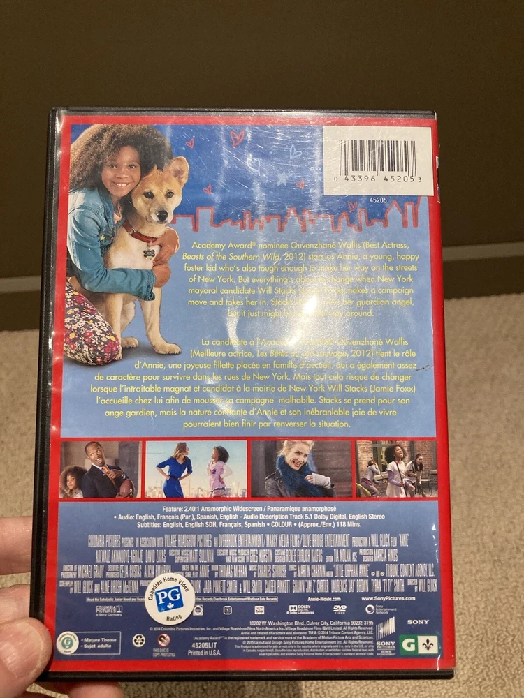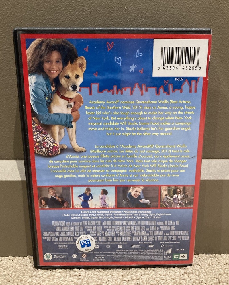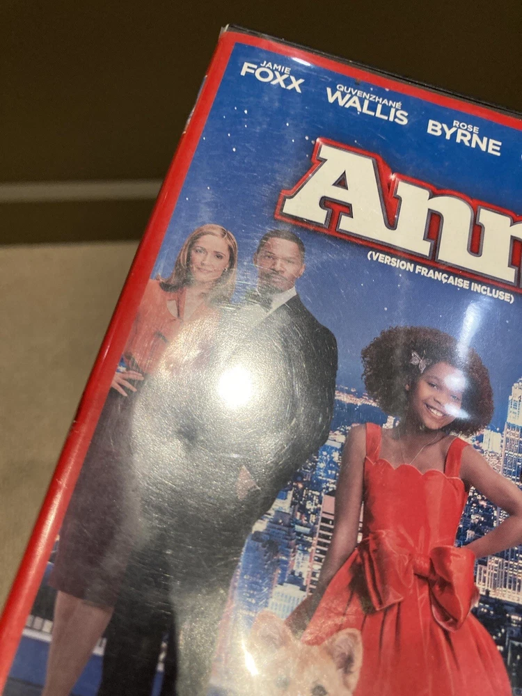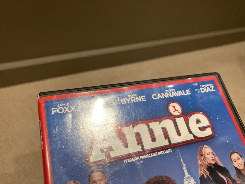 Annie (DVD, 2015, Widescreen, Canadian) *Case shows wear including scuffs and indentations (See Pictures). *there is also a small ‘PG’ rating sticker on back cover (See Pictures) even though movie is rated ‘G’. *DVD shows significant signs of use including superficial marks on both label and reading side (See Pictures). Tested. Disc plays with no issues. I watched the full movie on my PS3 Console with no issues (No Freezing, No Skipping). - U.S. buyer is responsible for any applicable duties and import fees.