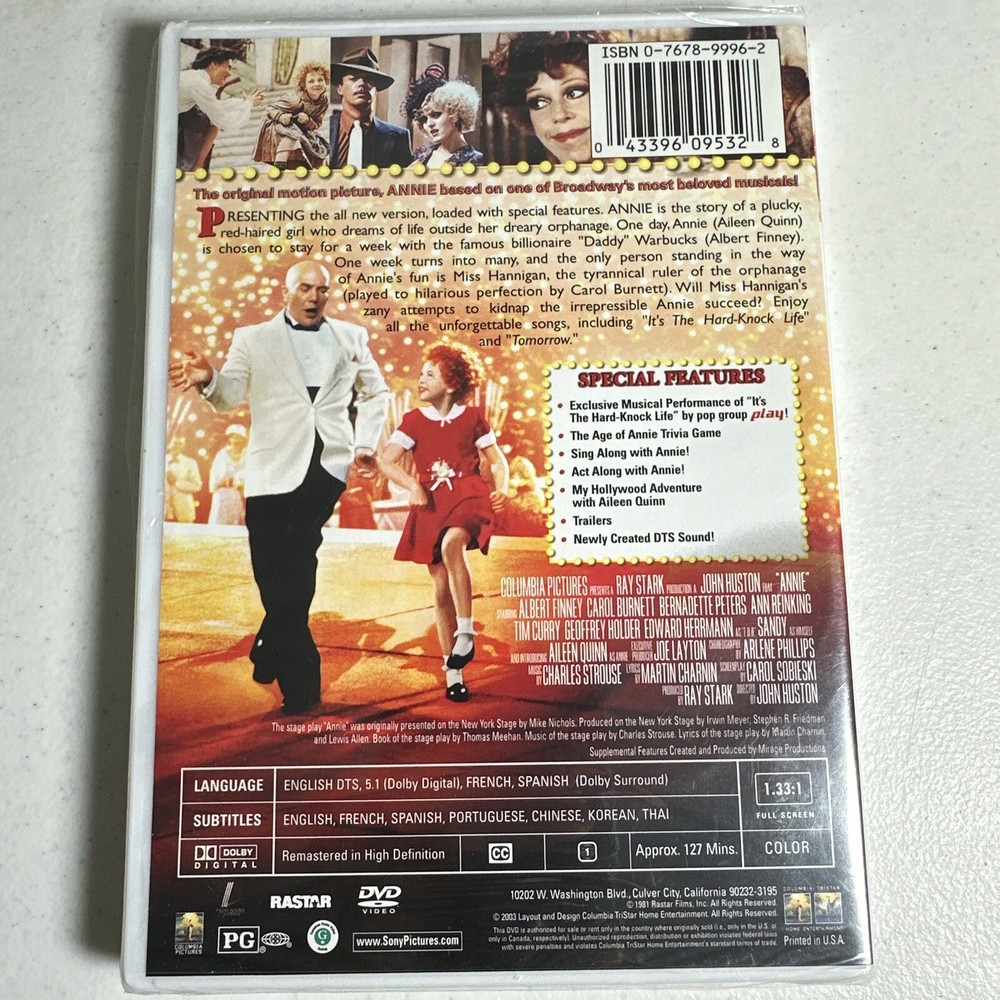 This special anniversary edition DVD of Annie is a must-have for any movie collector or fan of musicals. The film, released in 2004, features an all-star cast and memorable songs that will have you singing and dancing along. The DVD is brand new and sealed, ensuring that you receive a pristine copy of this classic movie. It is formatted for Region 1 (US, Canada...) and features English language and subtitles. This edition also includes special features and bonus content that are sure to delight fans of the film. Add Annie to your collection today! A1