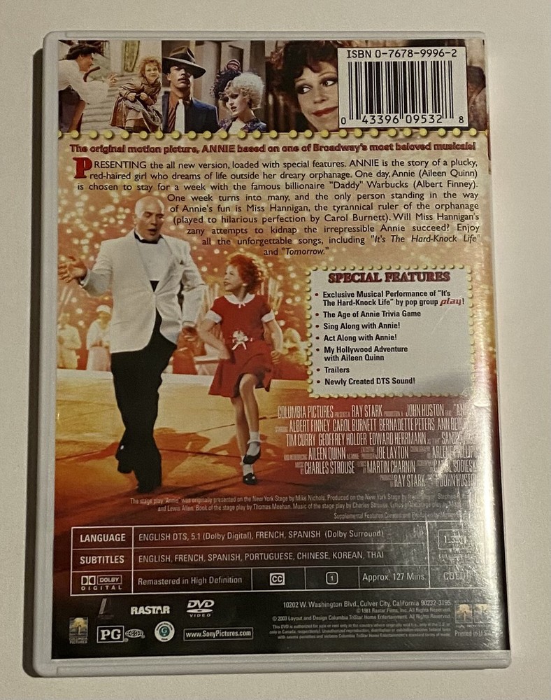 This special edition DVD of Annie is a must-have for fans of musicals and family-friendly movies. Starring Albert Finney, Tim Curry, Bernadette Peters, and Carol Burnett, this PG-rated film is a perfect addition to any movie collection. The DVD format ensures that you can enjoy the movie anytime and anywhere you want, and the English language makes it accessible to a wide audience. The Annie DVD Special Anniversary Edition is produced by Sony Pictures and is categorized under movies and TV, DVDs and Blu-ray discs. Its sub-genres include music and family, while the genres are children's and family and musical. This DVD is a perfect gift for anyone who loves musicals and family movies.