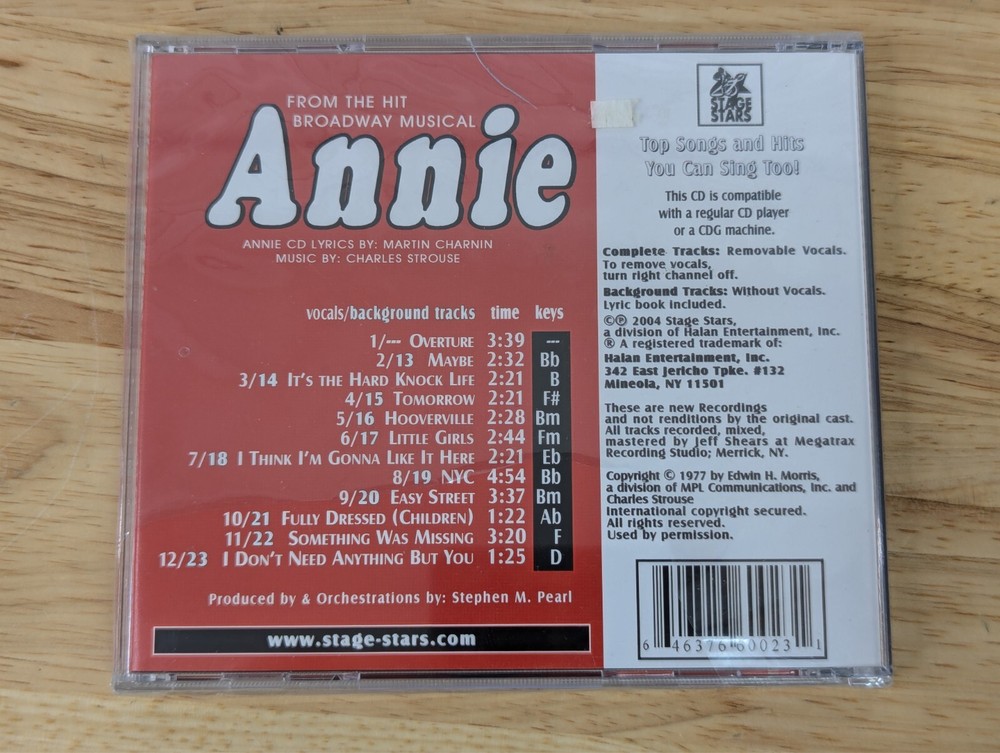 This karaoke CD is a blast for Annie fans! The tracks are clear, fun, and perfect for singing along. Great sound quality, and since it's sealed, it feels brand new. A must-have for musical theater lovers who want to belt out classics like "Tomorrow" and "Hard Knock Life." Highly recommend!