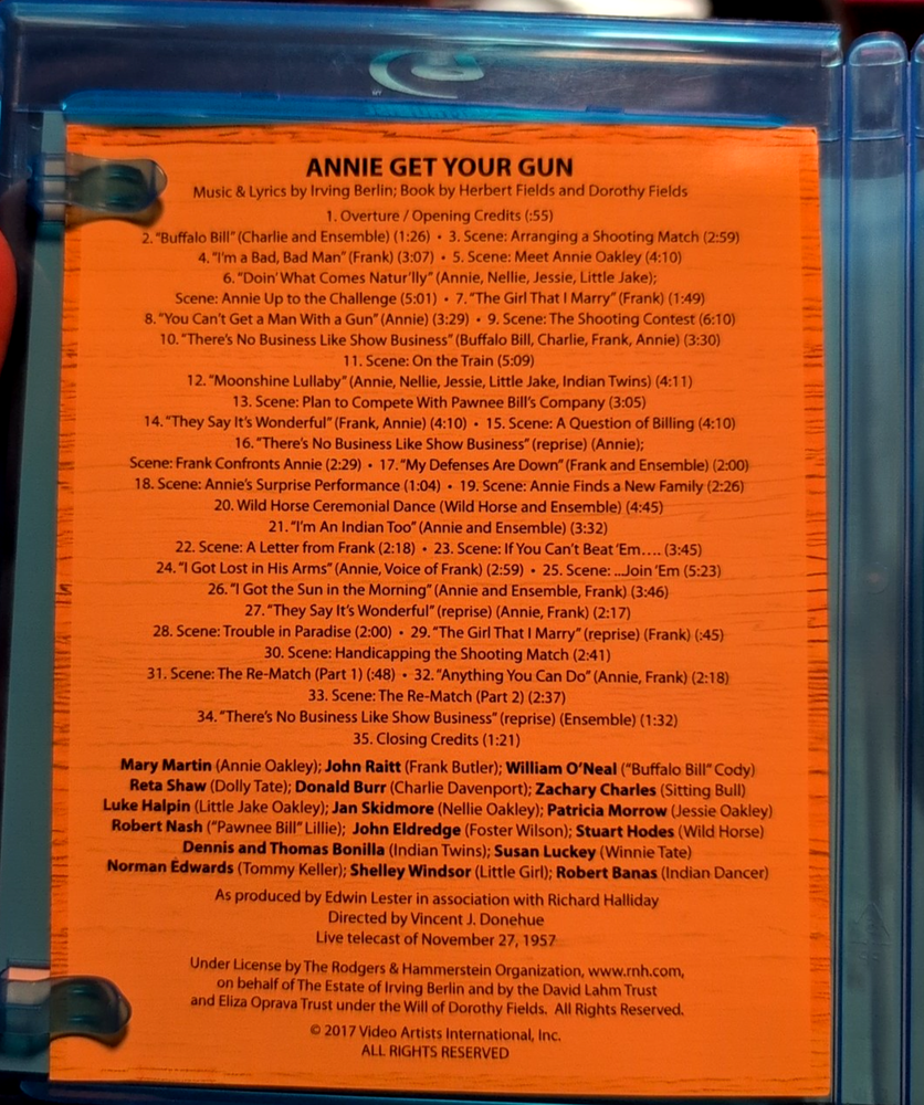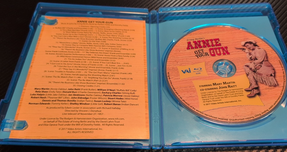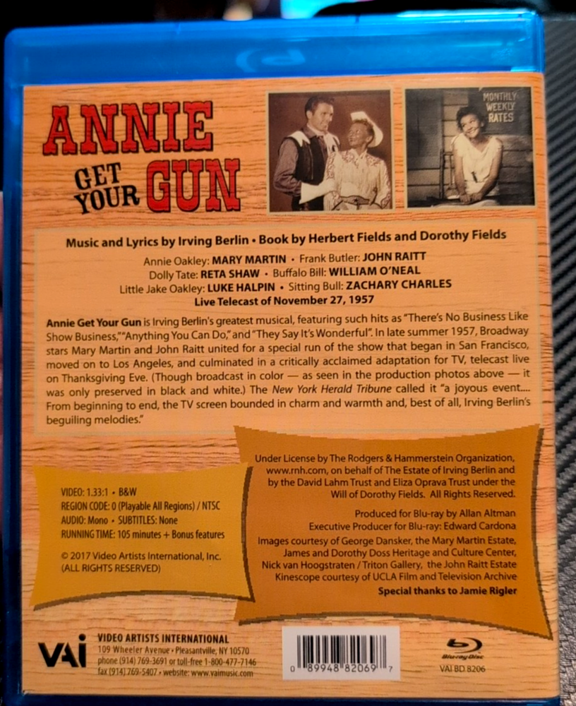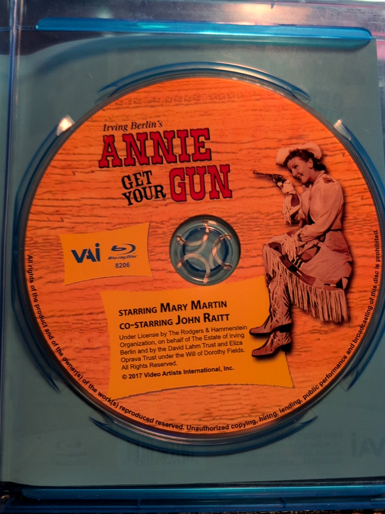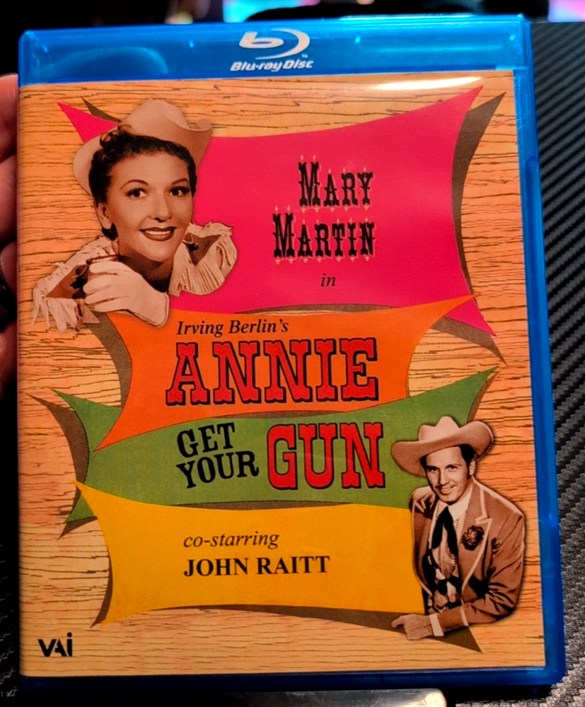 Annie Get Your Gun (1957 TV) Blu-ray - Mary Martin, John Raitt - LIKE NEW! Step right up and experience the classic Irving Berlin musical "Annie Get Your Gun," presented in this beloved 1957 televised production on Blu-ray! This iconic version stars the legendary Mary Martin as Annie Oakley and the superb John Raitt as Frank Butler, bringing the timeless songs and charming story to life. This listing is for the Blu-ray disc of the 1957 televised production of "Annie Get Your Gun," featuring Mary Martin and John Raitt. The disc and case are in like-new condition. Highlights: Classic Musical: Enjoy one of the most beloved musicals of all time with unforgettable songs by Irving Berlin. Star-Studded Performance: Features the celebrated performances of Broadway icons Mary Martin and John Raitt. 1957 Televised Production: Own a piece of television history with this acclaimed live broadcast version. Blu-ray Quality: Experience this classic production with the best possible picture and sound quality available on Blu-ray. Like New Condition: The disc and case are in pristine condition, showing no signs of wear. Condition: Like New (Disc and case are in like-new condition.) Don't miss this opportunity to own the classic 1957 televised production of "Annie Get Your Gun" starring Mary Martin and John Raitt on Blu-ray, in like-new condition!