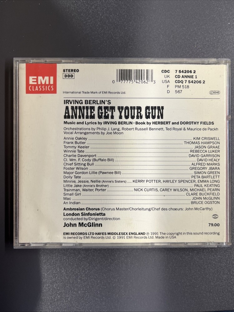 Annie Get Your Gun [1990 Studio Cast] Original Soundtrack is a must-have for fans of soundtracks and musicals. This CD features the Ambrosian Chorus, Original Soundtrack, and London Sinfonietta, with a total run time of 79 minutes. The album was produced by Simon Woods and released by EMI Classics in September 1991. The CD includes iconic tracks such as "I Got Rhythm," "Annie," and "Anything Goes." The album's genre is Soundtracks & Musicals, and it is a great addition to any music lover's collection. Get your hands on this timeless album and relive the magic of the 1990 studio cast production of Annie Get Your Gun.