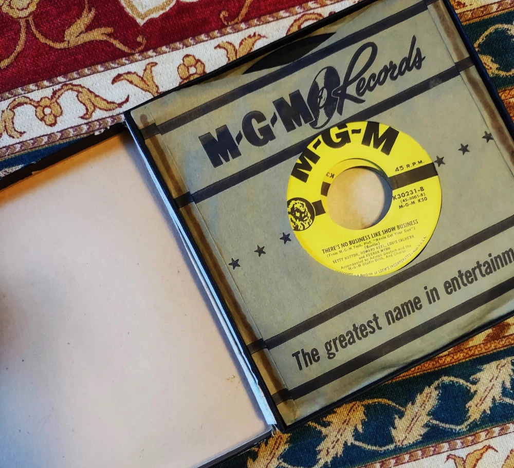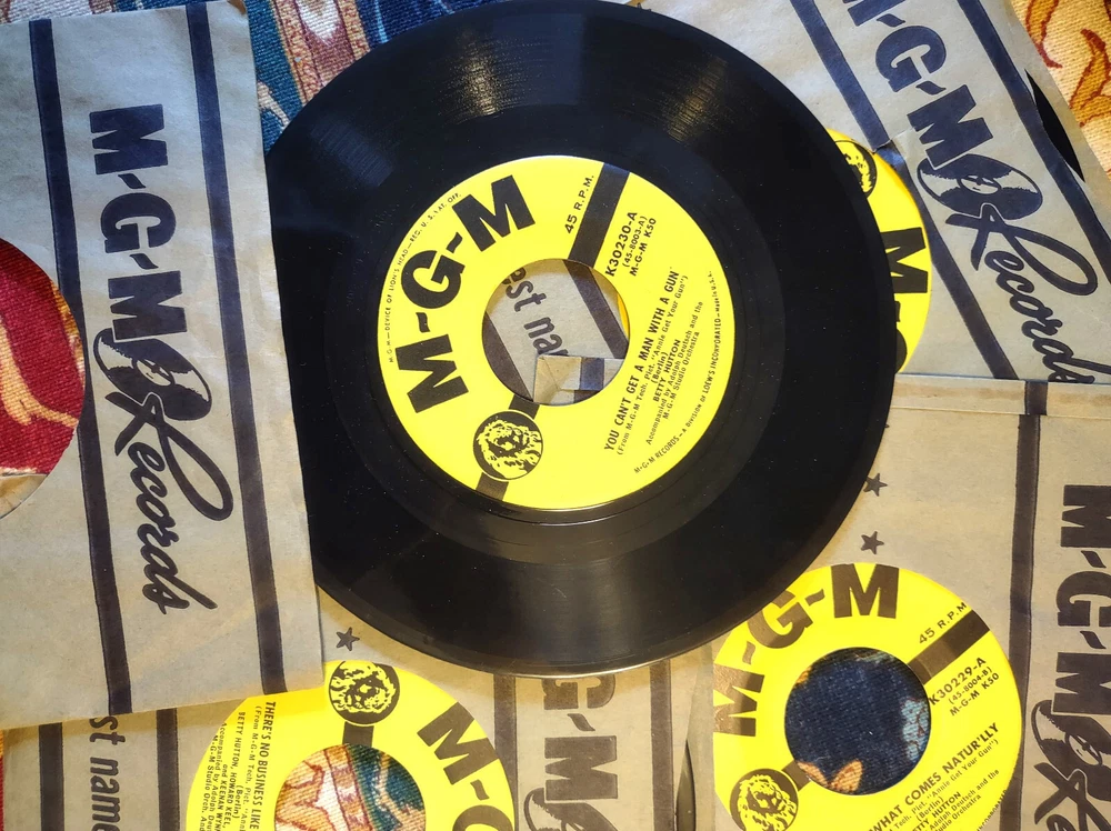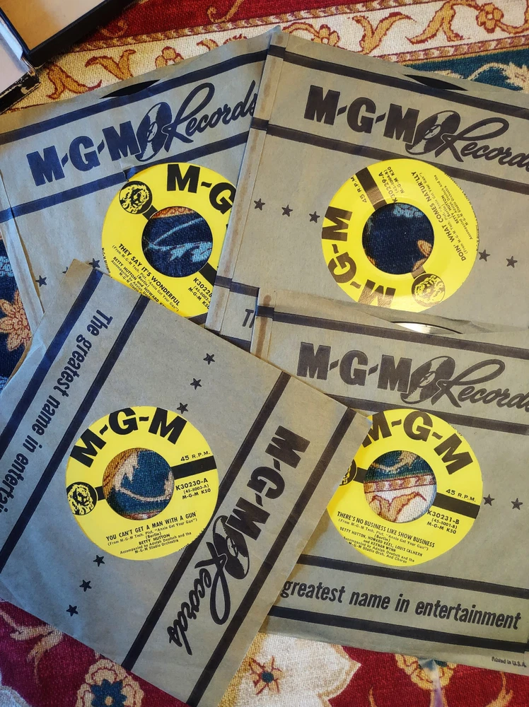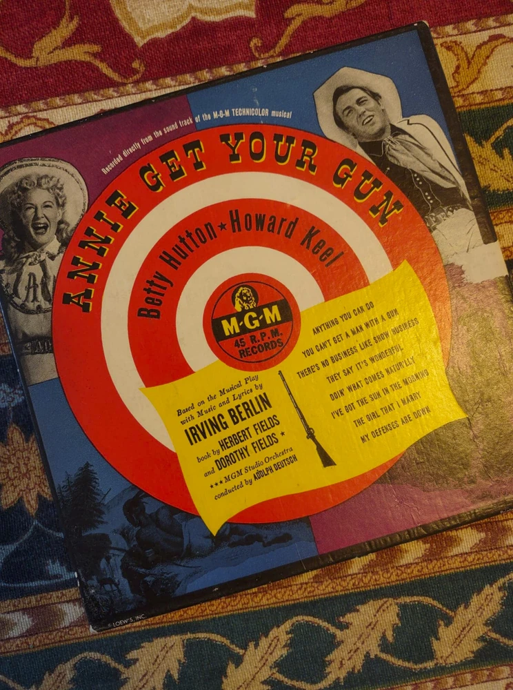 Here is the MGM soundtrack collection of original music to Annie Get Your Gun with Betty Hutton and Howard Keel. There are 4 45 rpm records still in their paper sleeves inside the box. Songs include Doin' What Comes Naturally: Betty Hutton The Girl that I Marry: Howard Keel You Can't Get a Man without a Gun: Betty Hutton My Defenses are Down: Howard Keel There's No Business Like Show Business: Betty Hutton, Howard Keel, Louis Calhern, and Keenan Wynn Anything You Can Do: Betty Hutton, Howard Keel They Say it's Wonderful: Betty Hutton, Howard Keel I've Got the Sun in the Morning: Howard Keel Thanks so much for checking out my listing!