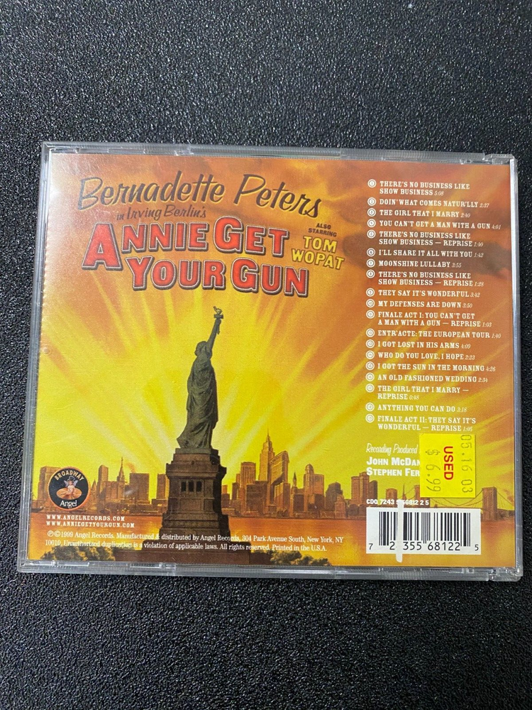 The product is a CD featuring the musical "Annie" with performances by Bernadette Peters and Tom Wopat. Released by Angel Records, this soundtrack showcases the talents of these artists in the genre of Soundtracks & Musicals. Fans of the classic show can enjoy the music in CD format, making it convenient to listen to at home or on the go. With Bernadette Peters and Tom Wopat lending their voices to the iconic songs, this CD is sure to delight fans of musical theater.