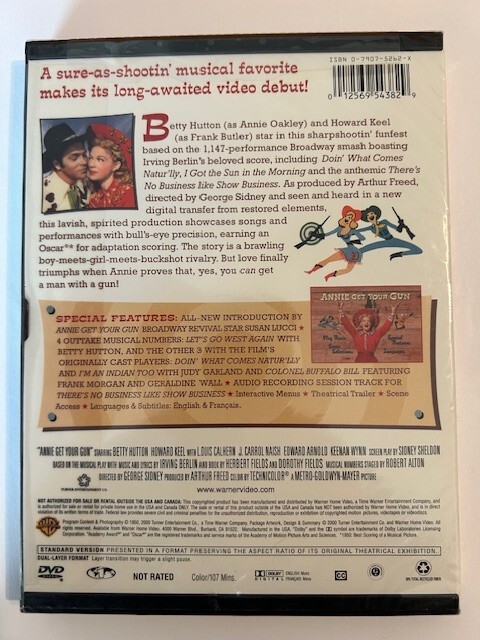 Annie Get Your Gun DVD is a standard edition DVD that includes special features. It is factory sealed and brand new. The DVD features music and family genres, making it a great choice for all ages.