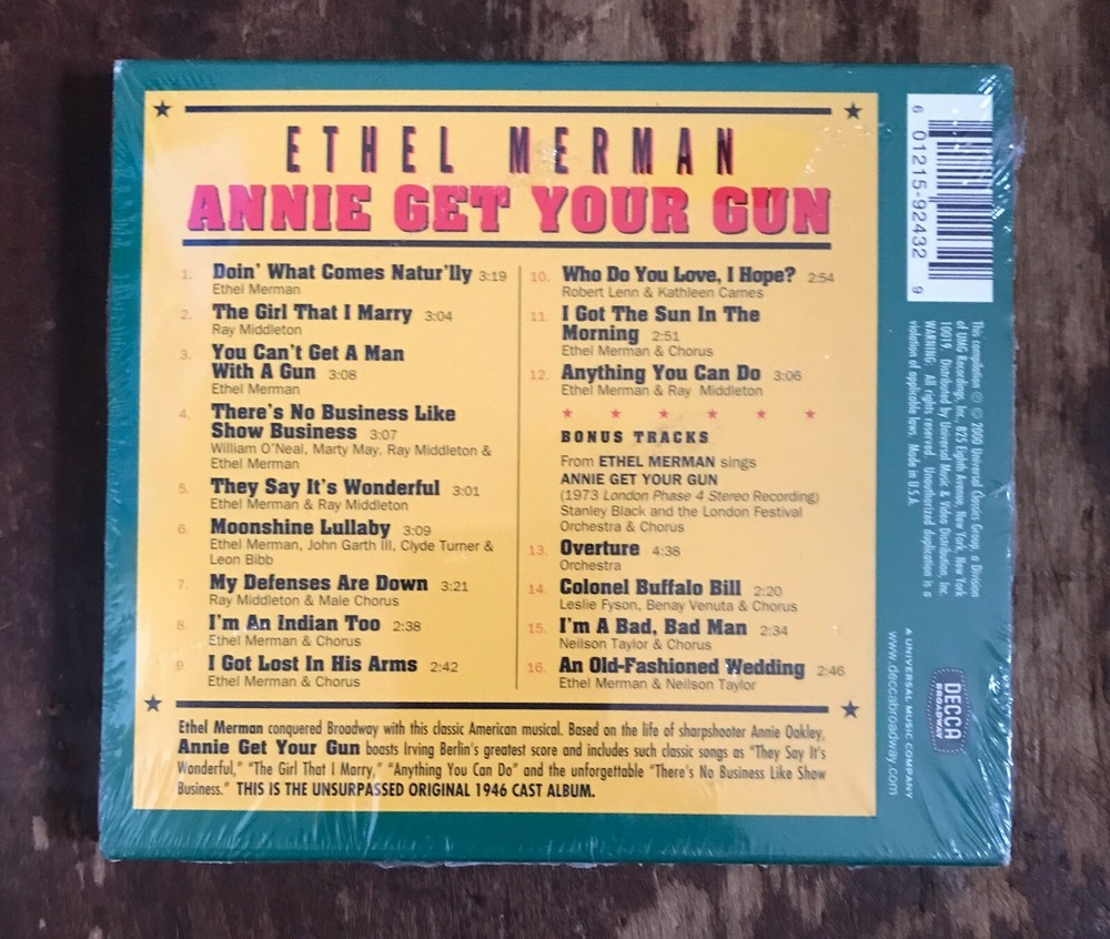 Annie Get Your Gun Ethel Merman Original Broadway Cast + Bonus Tracks New New CD CD surface and artwork are in NEW condition. I grade the CD and artwork, & make sure the plastic case is intact inside and out. The plastic CD cases may have a tiny scratch or two: please see photos of actual item on offer including CD surface and plastic CD case. The classic soundtrack to the Broadway Show starring Ethel Merman! Annie Get Your Gun CD Tracks: Please see photos for tracklisting! UPC: 601215924329 Please see photos of actual item on offer including CD surface. Ships promptly (via Media Mail) in a padded envelope in the continental U.S.A., or choose the FIRST CLASS option if you prefer! Please visit my store for music and movie collectibles and vintage items: CDs, LPs, 8-Tracks, VHS, DVDs, Concert T-Shirts & more! https://www.ebay.com/str/greasykidstuffmusicmemorabilia