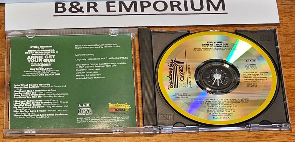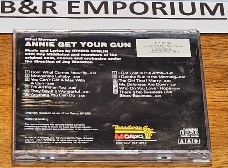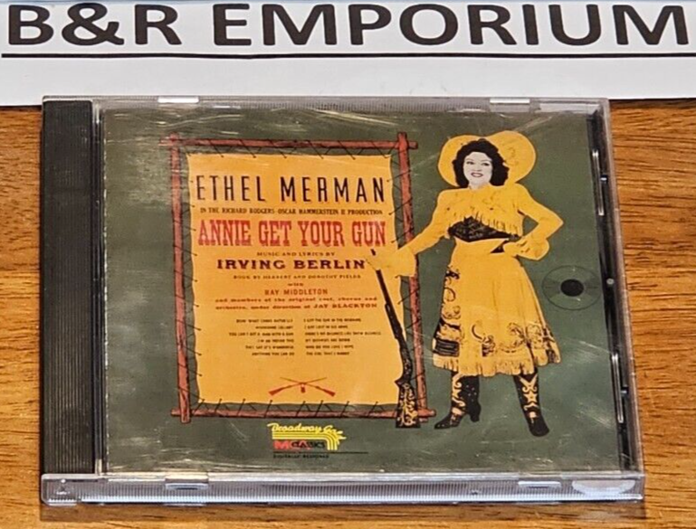 Annie Get Your Gun - Ethel Merman, Original Cast 1990 CD on MCA Classics (MCAD-10047), part of the "Broadway Gold" series. This is a music club CD. The disc is in very good condition . Includes the back inlay and a 4-panel booklet in a standard jewel case. The jewel case has some wear and scratches - see photos. ___________________________________________________________________________________ Welcome to B&R Emporium! We appreciate you taking the time to visit our eBay pages. If you have any questions about the items we have for sale, please feel free to ask. We have been selling on eBay for many years, and we want you to feel confident about your purchase. T he description above refers to the item(s) pictured (we always provide photos of the actual item(s) for sale). Thanks again from Barbara & Ron (B&R Emporium).