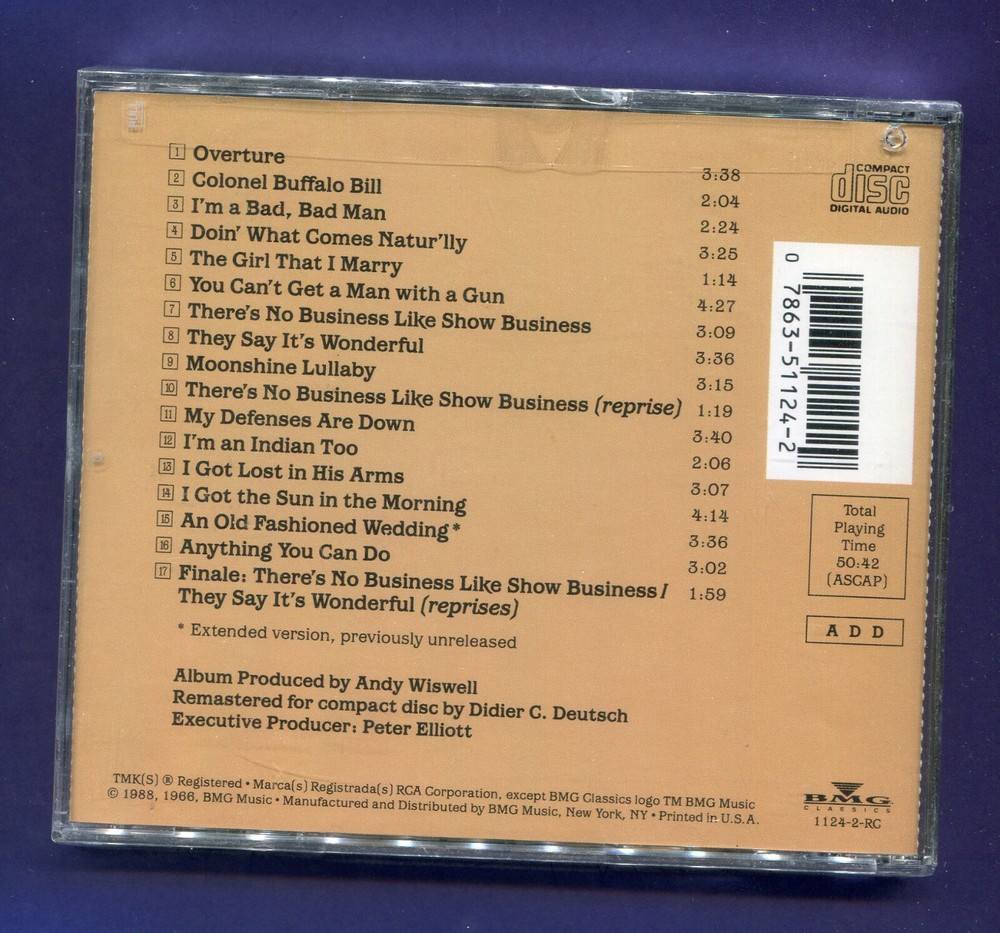 Annie Get Your Gun Ethel Merman Original Cast Recording Music CD (1988) RCA Victor New Sealed 1124-2-RC CONDITION : New/Still Factory Sealed -- 1.5" diagonal crack to plastic jewel case on top front. FORM OF PAYMENT : PayPal only. Please send me payment within 7 days of auction close. SHIPPING/HANDLING/PACKAGING, & COMBINED SHIPPING : Once I receive your cleared payment, I timely ship to you within 3 to 5 business days. I will send you an email with delivery tracking information. All my auctions come well-packaged when shipped out. I will combine shipping costs on two or more items won by the same bidder. All my items come from a smoke-free/pet-free environment. ALL INTERNATIONAL BIDDERS WELCOME : I ship anywhere in the world. $18.00 to ship internationally. Please read my International Shipping Rules before placing a bid. · Import duties, taxes, and charges are not included in the item price or shipping charges. These charges are the buyer's responsibility. · Please check with your country's customs office to determine what these additional costs will be prior to bidding/buying from me. · These charges are normally collected by the delivering freight (shipping) company or when you pick the item up. Please do not confuse them for additional shipping charges. · I do not mark merchandise values below value or mark items as "gifts". US and international government regulations prohibit such behavior. 14-DAY RETURN POLICY : If my item arrives to you damaged or you are not completely satisfied with the item upon receipt, I will work out a reasonable solution, including offering a partial or full refund. I offer a 14-Day hassle-free return policy. Please note that I will not pay for return shipping back to my place of business. MANY THANKS FOR LOOKING/SHOPPING : I want to personally thank you for checking out my auctions site of Treasuresinmyhome. Please check back on a regular basis and save me as one of your favorite Ebay sellers as I just might have what you are looking for. I add new items on a weekly basis. Please follow me on Twitter @ebay_man & Instagram @ebaymandavid.