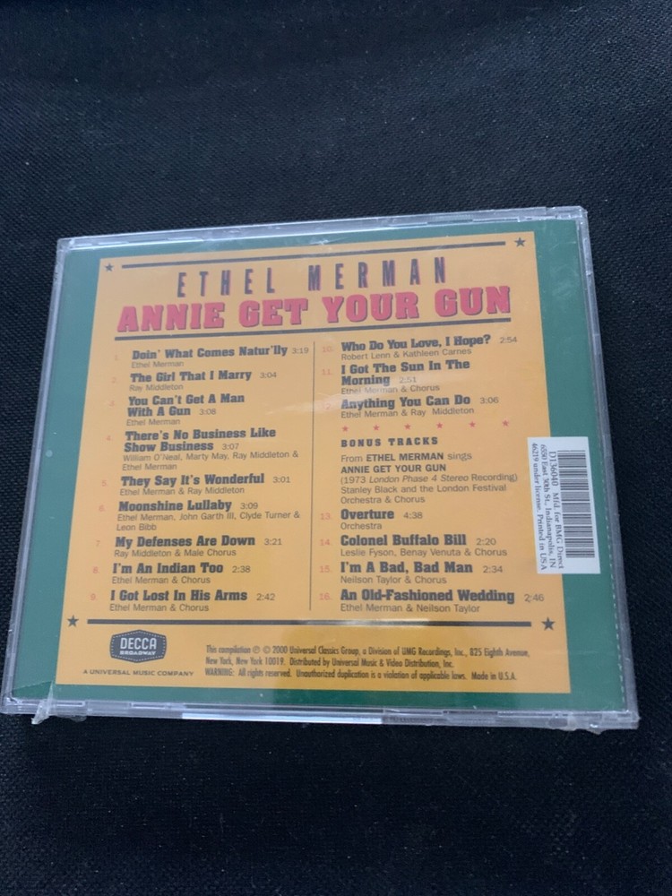 Immerse yourself in the golden age of Broadway with the original cast recording of "Annie Get Your Gun." Featuring the captivating Ethel Merman, this album is a quintessential piece for enthusiasts of show vocals and collectors alike. Released by Decca Broadway in 2000, it includes the bonus tracks that enhance the listening experience, presenting a fuller auditory journey. Presented in a standard jewel case, this CD comes brand new and sealed, ensuring the pristine quality of the audio tracks. The release title "Annie Get Your Gun" speaks to one of the most beloved musicals, and with features such as a slipcover, it makes for a handsome addition to any music lover's collection. Enjoy the timeless tunes and the legacy of Broadway with this exceptional album.