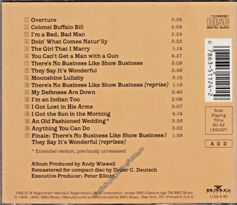 Get ready to enjoy the classic musical sounds of "Annie Get Your Gun" with this remastered CD Featuring the original 1966 musical cast, including Ethel Merman, Jeremy Orbach, and more, this album is a must-have for any fan of show vocals and musicals The CD grading is very good (VG) and comes in a standard jewel case with a multicolor design The album was released in 1988 by RCA Records (USA) and includes original inner sleeve and cover The catalogue number is 1124-2-RC This CD is perfect for collectors and fans of the 1980s era of musicals Don't miss out on the chance to own a piece of history with "Annie Get Your Gun" music CD We use our own photos, not stock photos, so you can see the actual item for sale The Music Room CDs, DVDs, Movies, TV, Cassettes, Vinyl Records Even though most of our items are pre-owned they still have plenty of life left in them The packaging may be scratched dirty or even have minor cracks None of these issues will affect the quality of the playback Even though we check them prior to selling, sometimes a minor flaw may get past us If you purchase a CD, DVD, Cassette or a record from us and you are not happy with its condition, please contact us so we can make it right We want you to be happy with your purchase from us Be sure to check out our Cassettes, CDs, DVDs, Vinyl Records and more in our eBay store We Will Combine Shipping whenever possible to save on shipping costs.