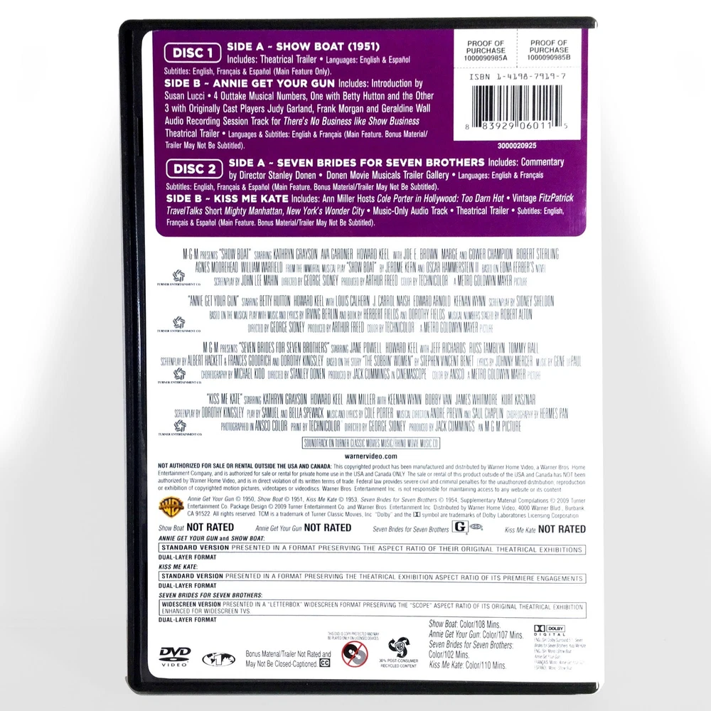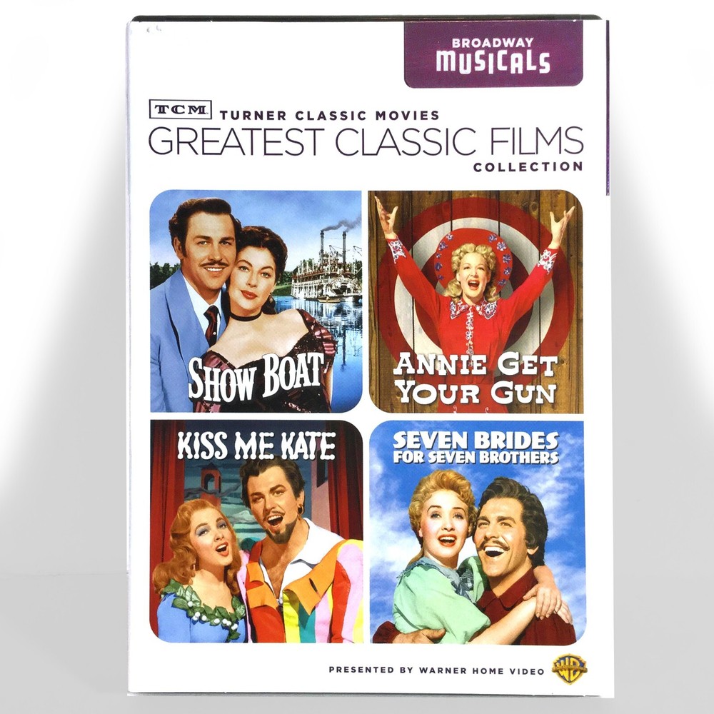 PLEASE READ INFORMATION & CAREFULLY REVIEW ALL PHOTOS ! Authentic, * Very Good Condition 2-Disc DVD of "TCM Greatest Classic Films Collection: Broadway Musicals - Widescreen & Full Screen Edition (1950 - 1954)" ! w/ Slipcover ! Includes: "Annie Get Your Gun" , "Show Boat" , "Kiss Me Kate" & "Seven Brides For Seven Brothers" ! * The DVD Case May Have Some Minor Shelf Wear ! Sold "As- Is" ! Total Running Time Approximately 427 Minutes ! Starring Howard Keel, Kathryn Grayson, Betty Hutton, Ann Miller, Ava Gardner, Jane Powell & Joe E. Brown ! ( please carefully review all photos ) Please Take A Look At My Other Listings Including Many Rare, Unopened DVD 's And Blu-Ray's ! I strive to ship very quickly, usually within 24 hours after payment is received (check my feedback). You will also automatically receive a tracking number for your package ! I package very carefully and use Bubble, Padded, Poly or Kraft Paper envelopes and will ship USPS Media Mail for most DVD' s & Blu-Rays. * Please Contact Me First Before Purchasing For Additional Cost For Extra Padding, Cardboard Protection And/ Or Shipping In A Box ! Sorry, but I do not ship internationally and ask that you please feel free to contact me with any questions!
