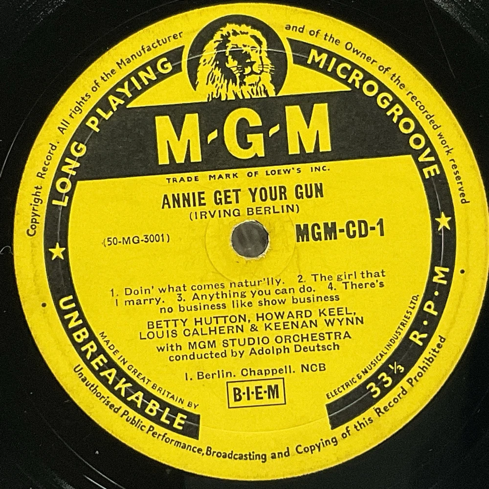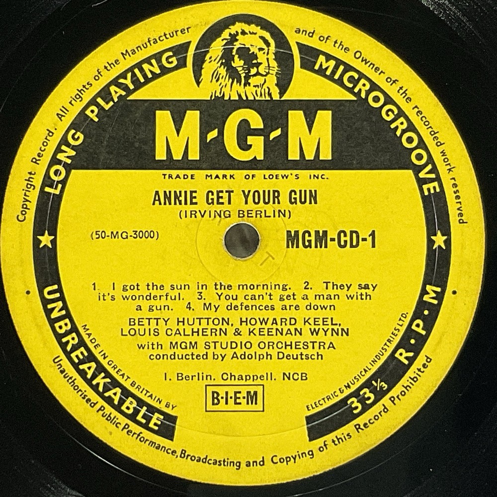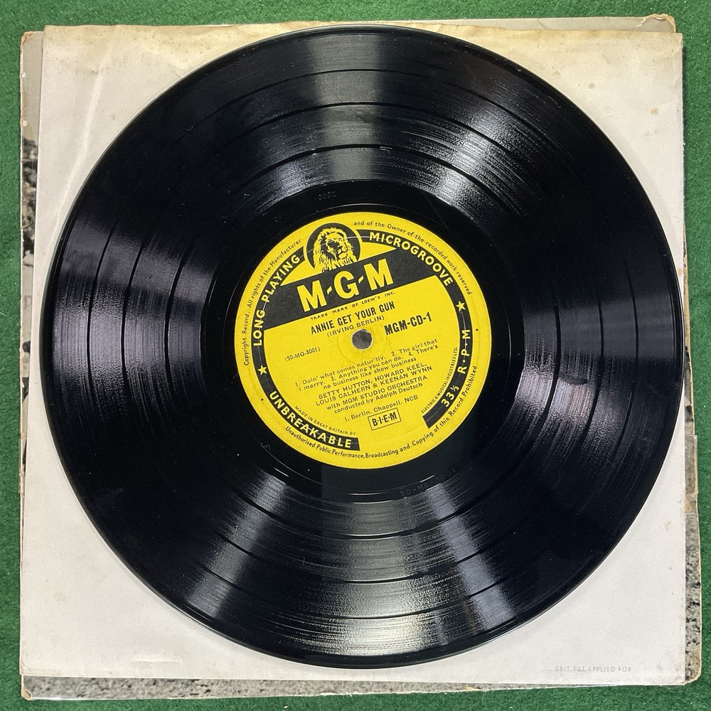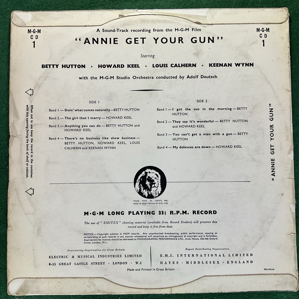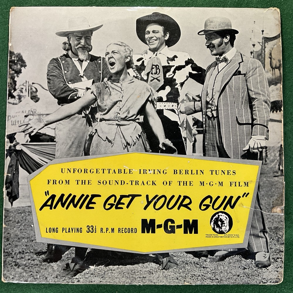 This is a vinyl LP record of the soundtrack for "Annie Get Your Gun" on GUN Records. The artist is listed as Various, in the genre of Soundtracks & Musicals. The record is a 10" in size and plays at 33 RPM speed. It comes in a cardboard sleeve with a very good (VG) inlay and sleeve grading. This original cast recording is a musical style release that captures the iconic songs from the show.