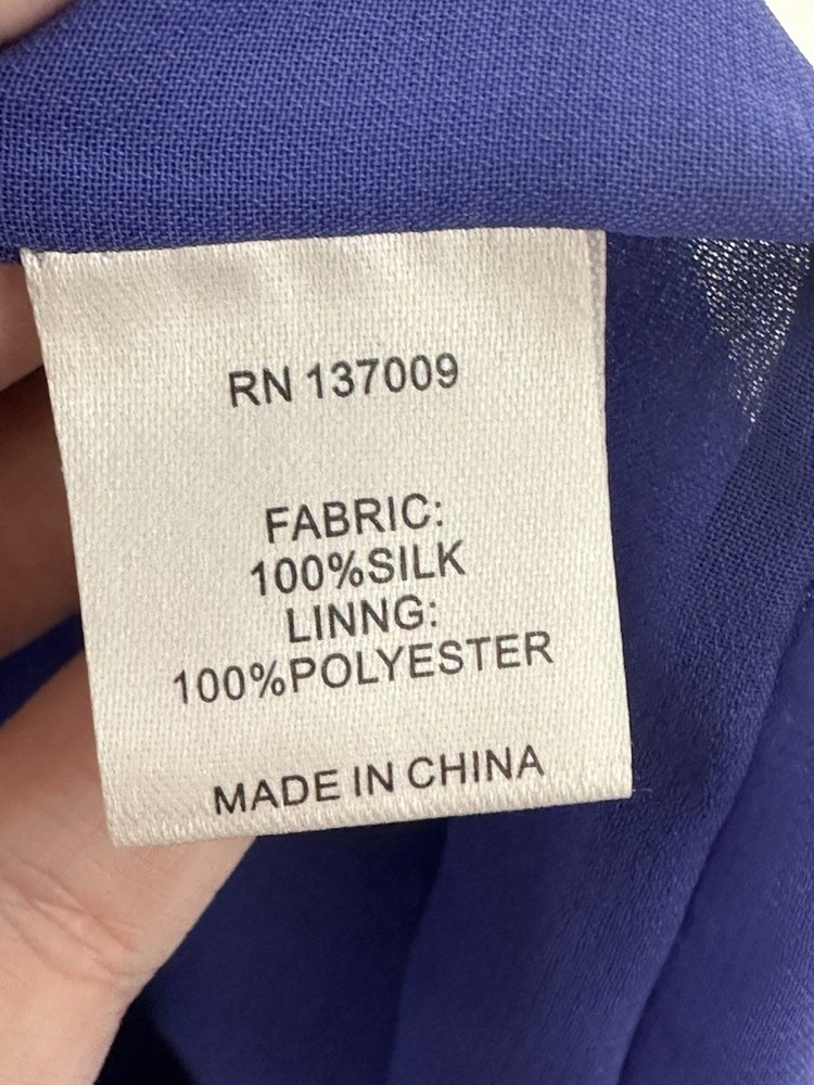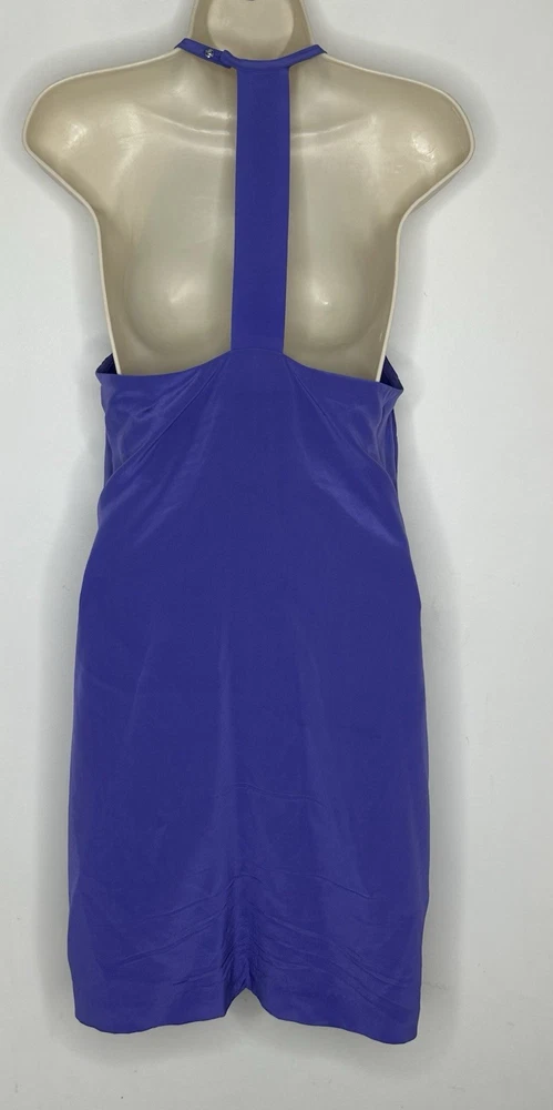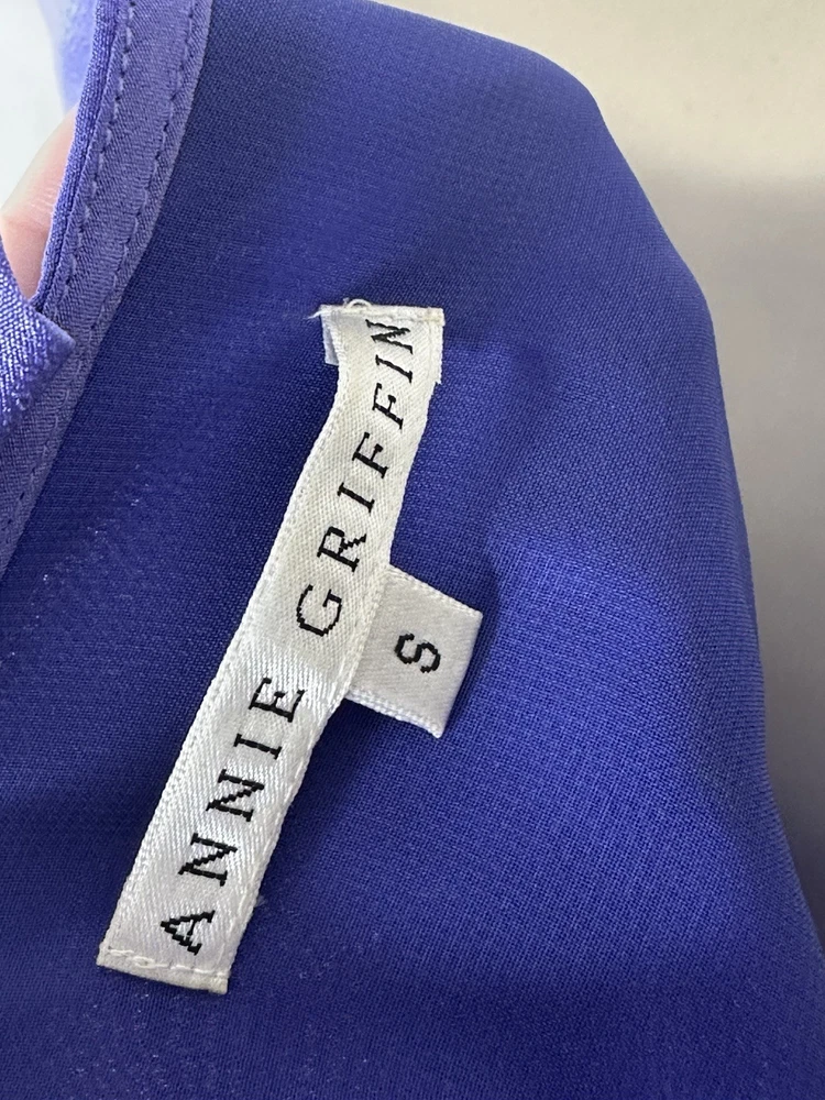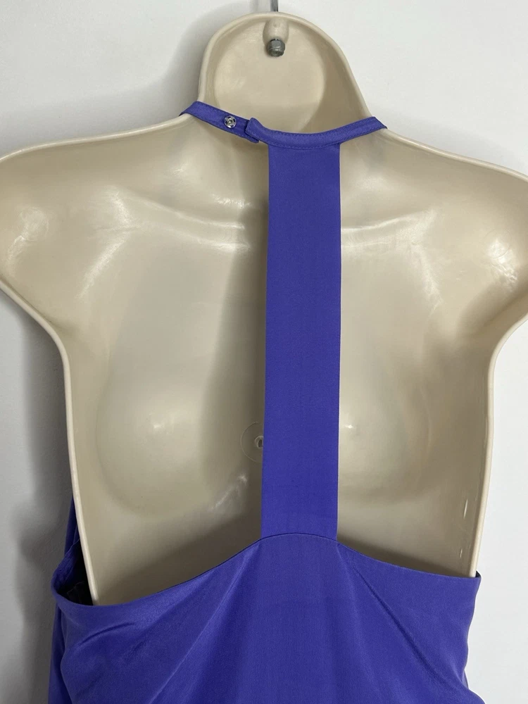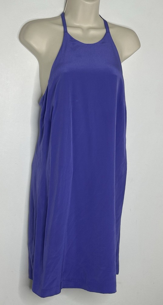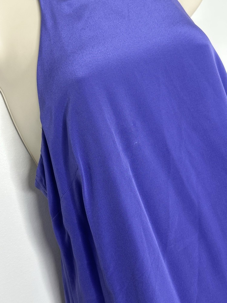 The Annie Griffin Women’s Lilac Purple 100% Silk Halter Sheath Dress in size Small is a stunning and elegant cocktail dress perfect for summer and spring parties. Made from luxurious chiffon fabric with a solid purple color, this sleeveless dress features a halter neckline, zip closure, and a short length. The dress is lined and designed with a classic and colorful theme, making it a chic and stylish choice for any special occasion. Bust 34” Waist 28” Length 36” Tiny mark R4