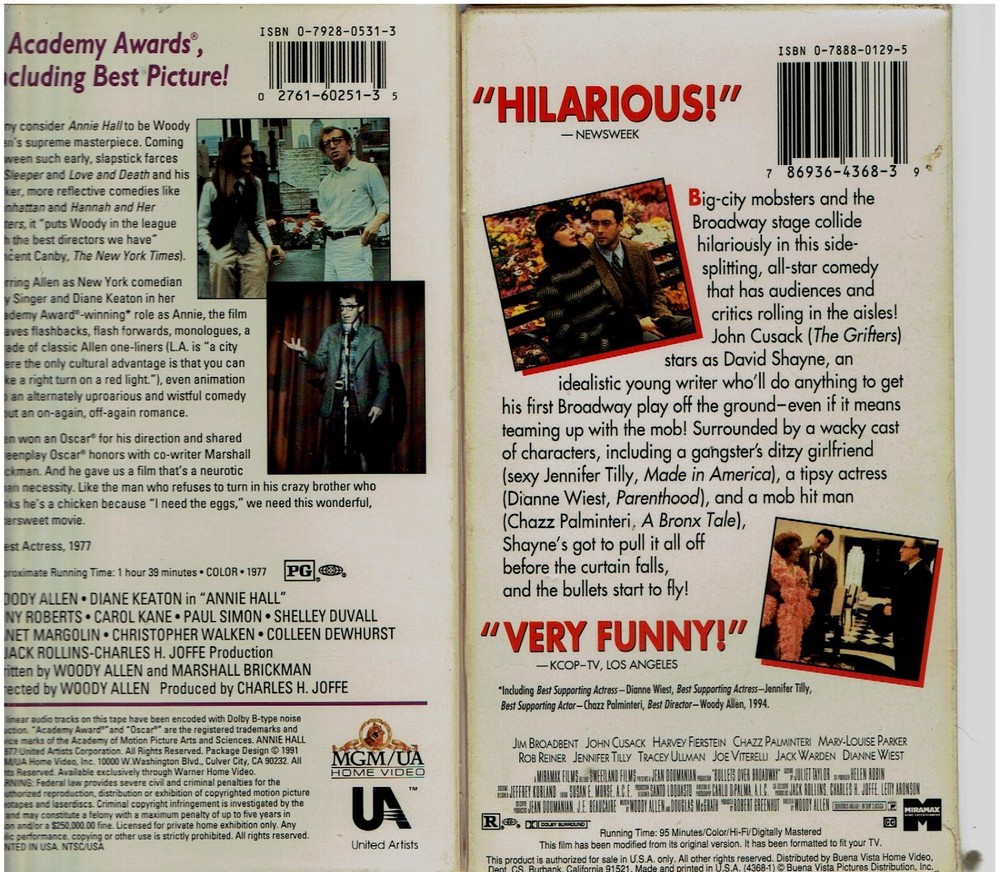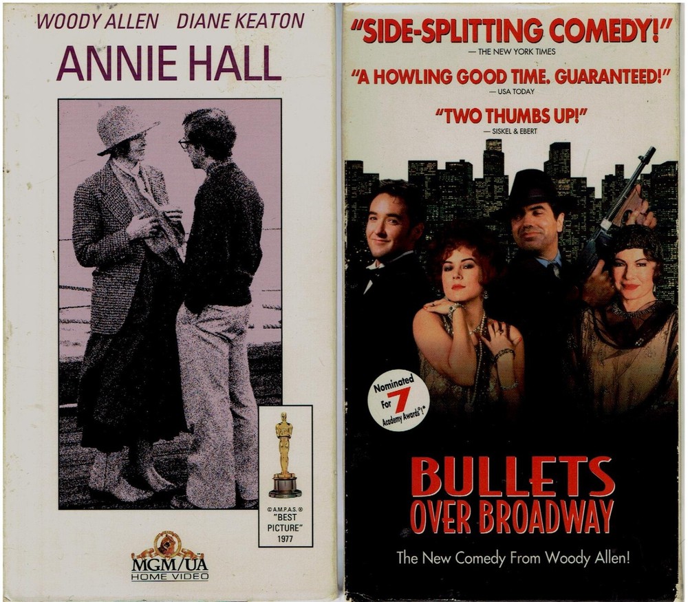 You are bidding on not one, but Two great Oscar-Winning movies by Woody Allen in VHS Tape Format. They are in Excellent+ Condition. They have been Tested and Play Fine. 1)Annie Hall, starring Woody Allen and Diane Keaton. 1991 MGM Video. 2)Bullets Over Broadway, written and directed by Woody Allen starring John Cusack. Was nominated for 7 Academy Awards. 1995 Miramax Video. Rated R. Thanks for looking!